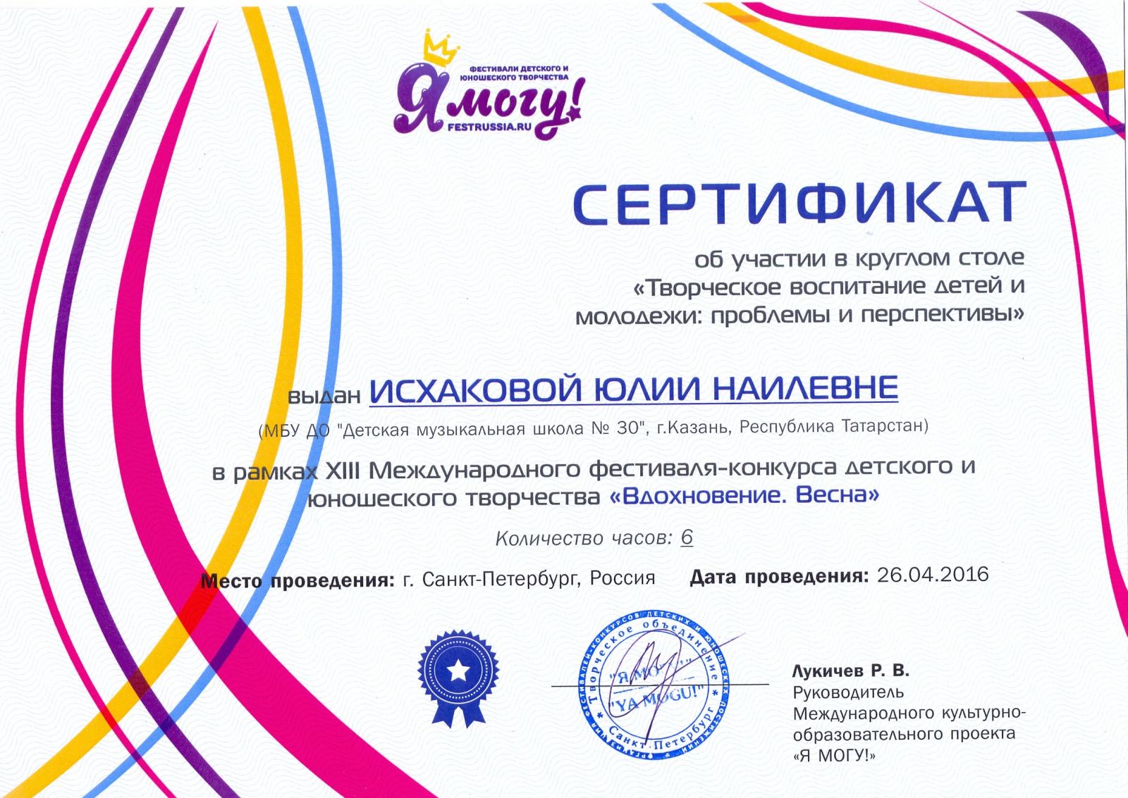Участие в круглом столе "Творческое воспитание детей и молодежи: проблемы и перспективы" в рамках XIII Международного фестиваля-конкурса детского и юношеского творчества "Вдохновение.Весна" (г.Санкт-Петербург) - Исхакова Ю.Н. - сертификат