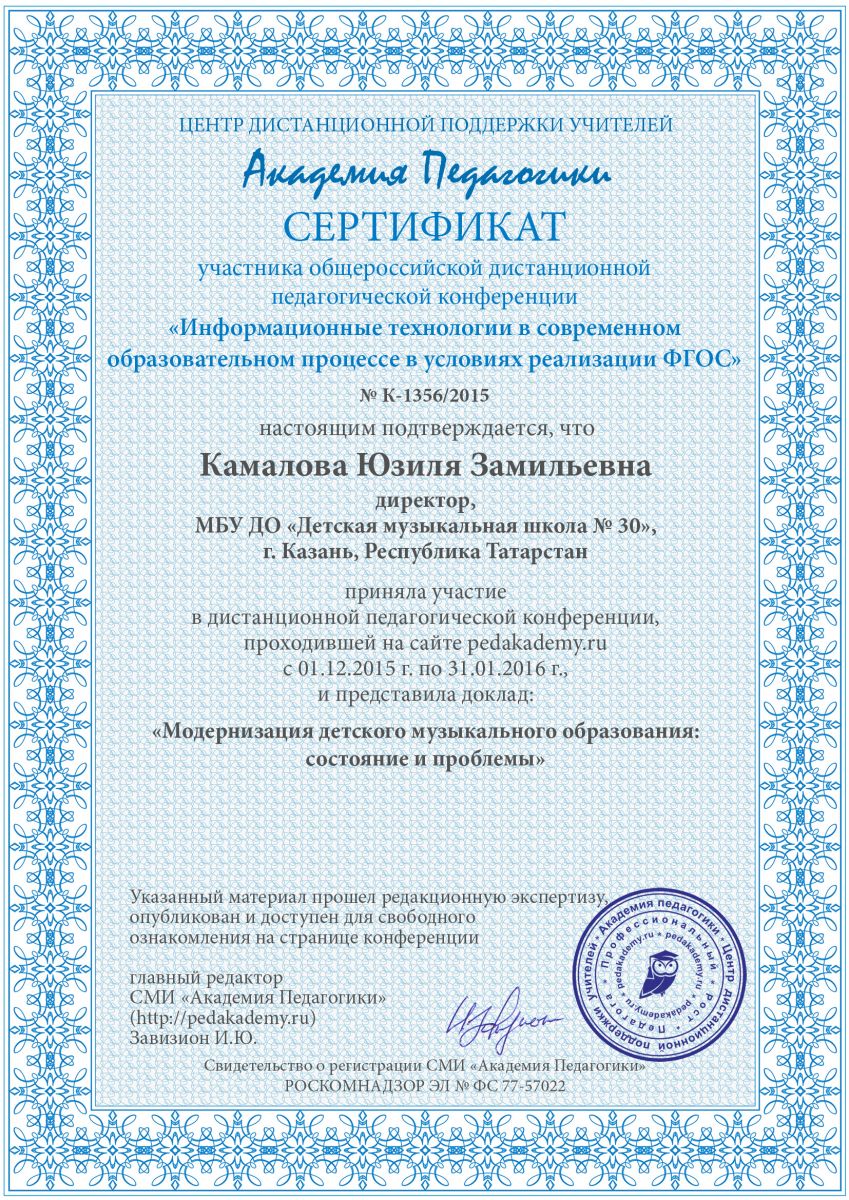 Общероссийская дистанционная педагогическая конференция «Информационные технологии в современном образовательном процессе в условиях реализации ФГОС» - доклад Камаловой Ю.З. на тему «Модернизация детского музыкального образования: состояние и проблемы»