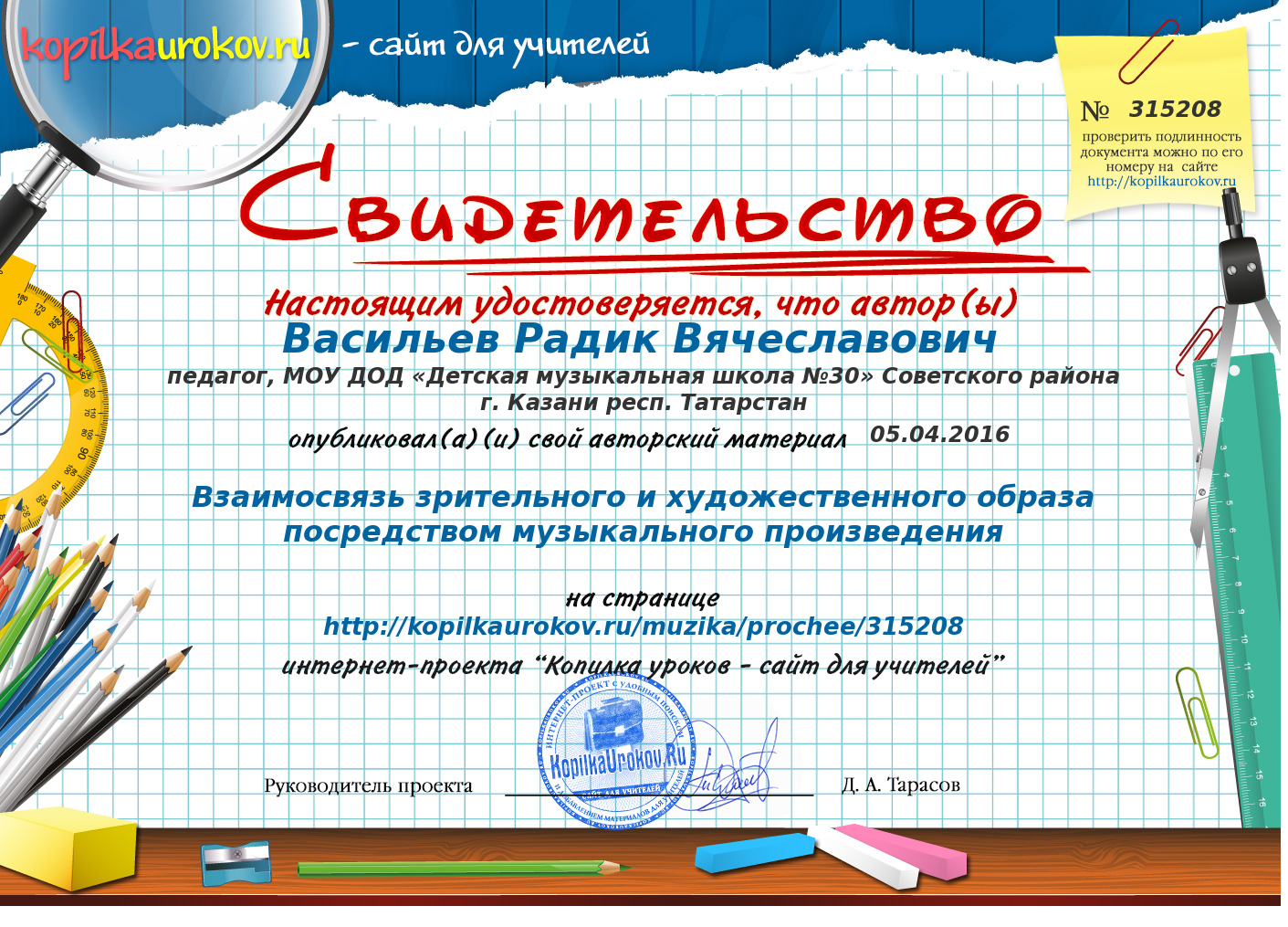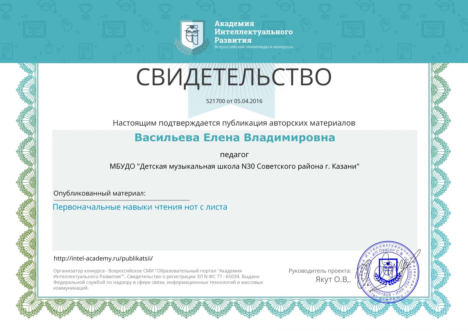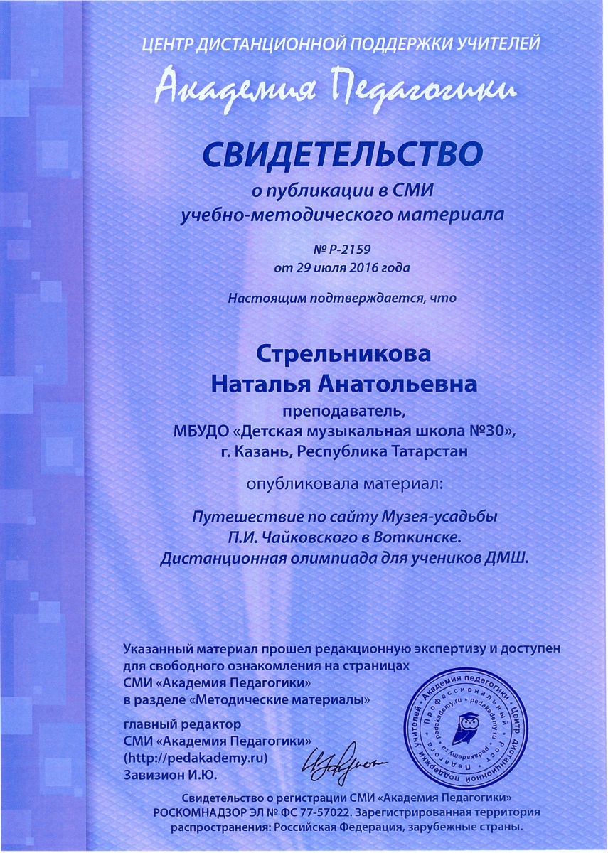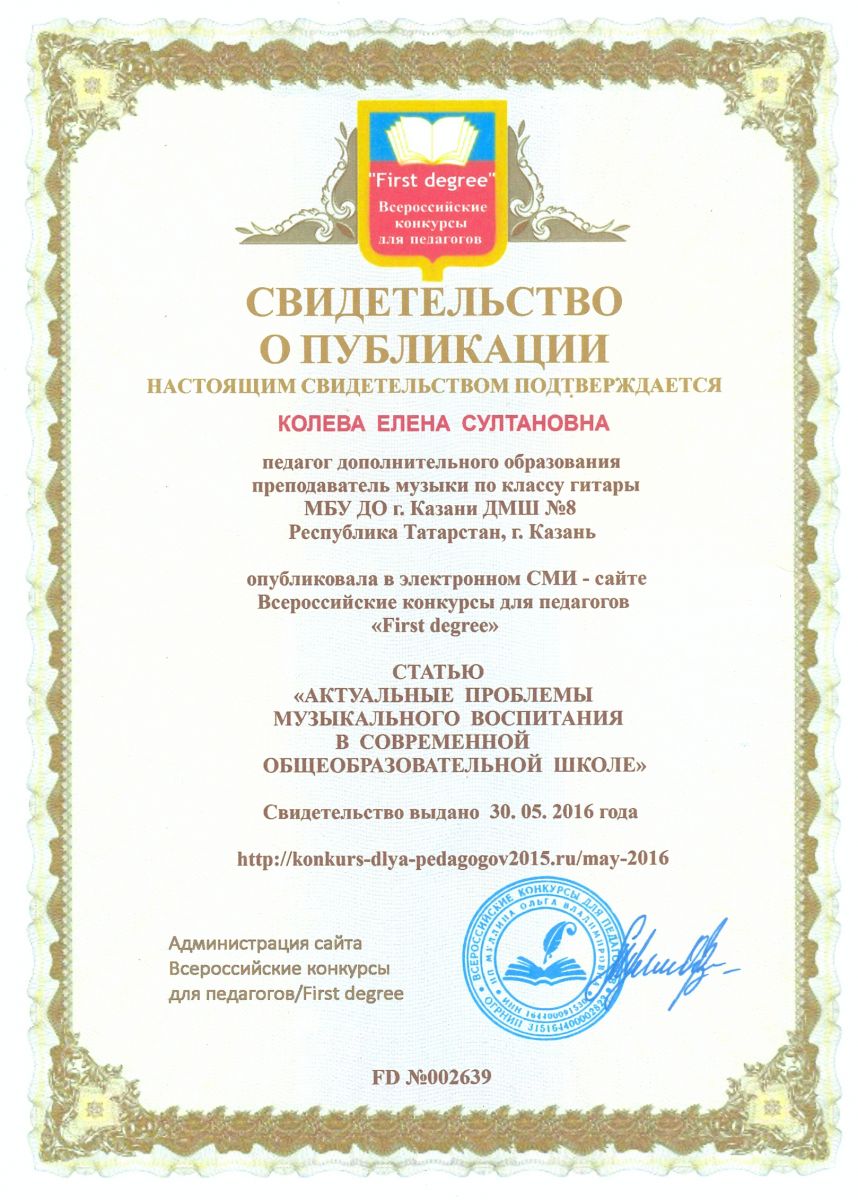 Статья "Практические аспекты реализации предпрофессиональных программ в учебном процессе ДМШ и ДШИ" в электронном научно-методическом журнале Kazanobr.u № 14 июнь 2016, автор Камалова Ю.З. http://smi.kazanobr.ru/14/05.html