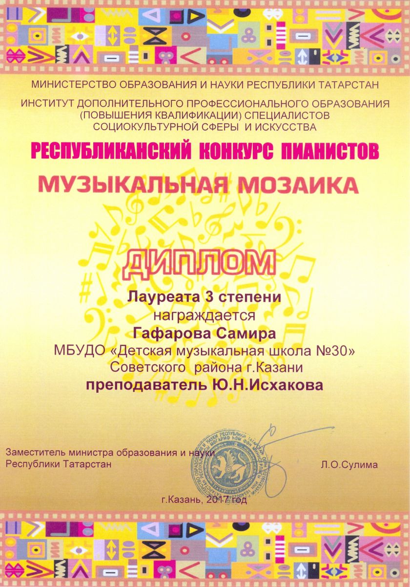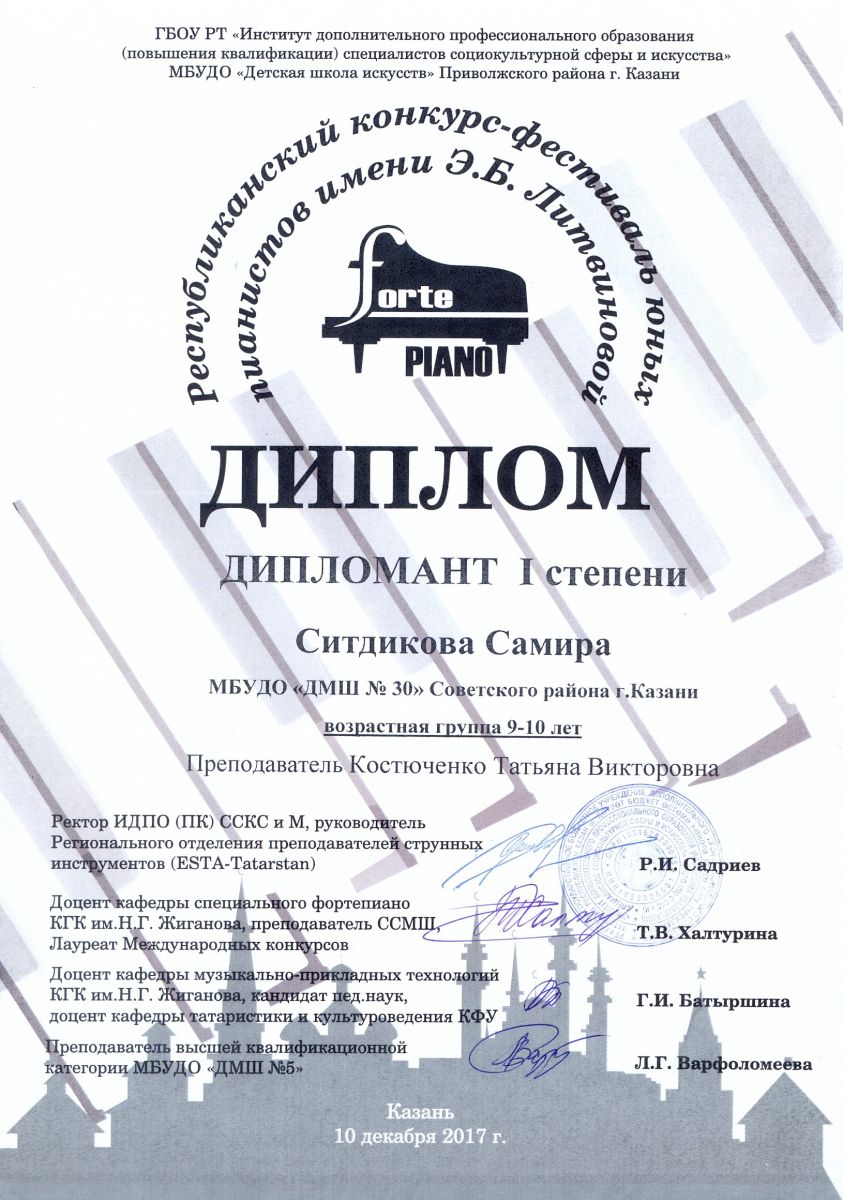 Республиканский конкурс пианистов "Музыкальная мозаика" - Ситдикова Самира - диплом II степени
