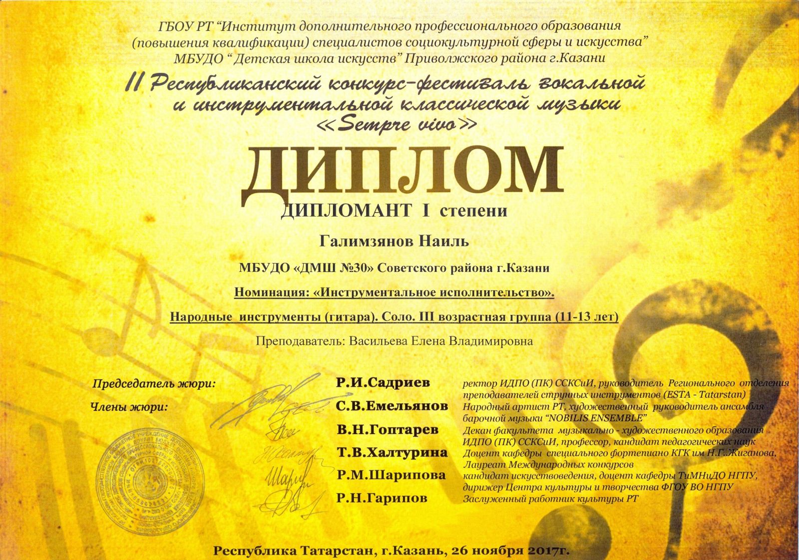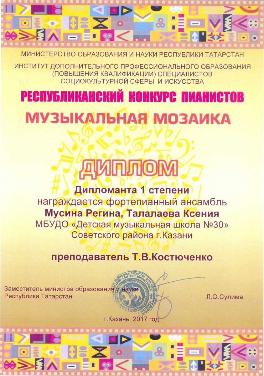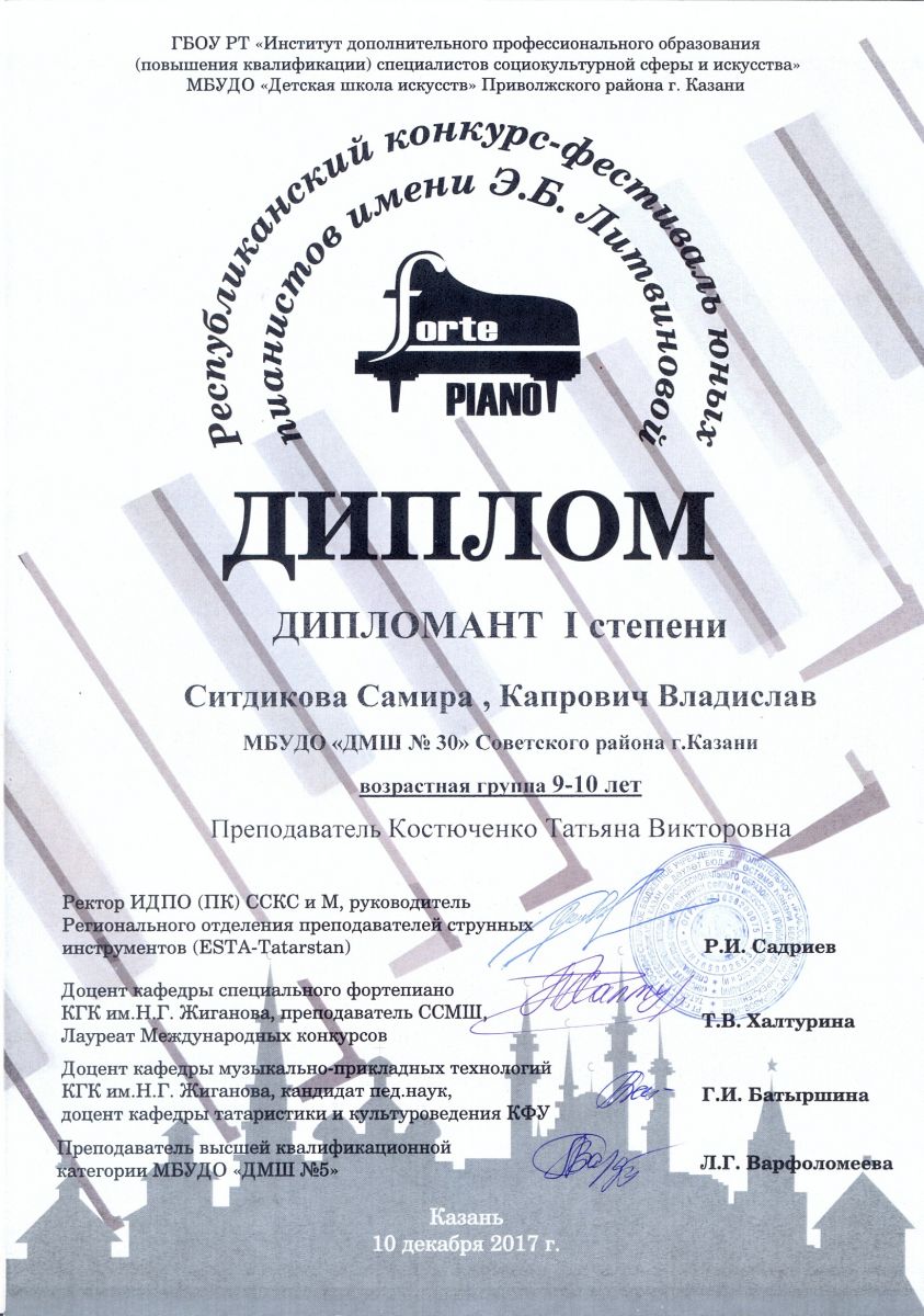 Республиканский конкурс пианистов "Музыкальная мозаика" - Ситдикова Лия - диплом I степени