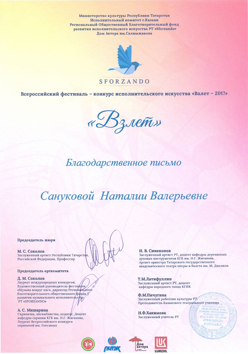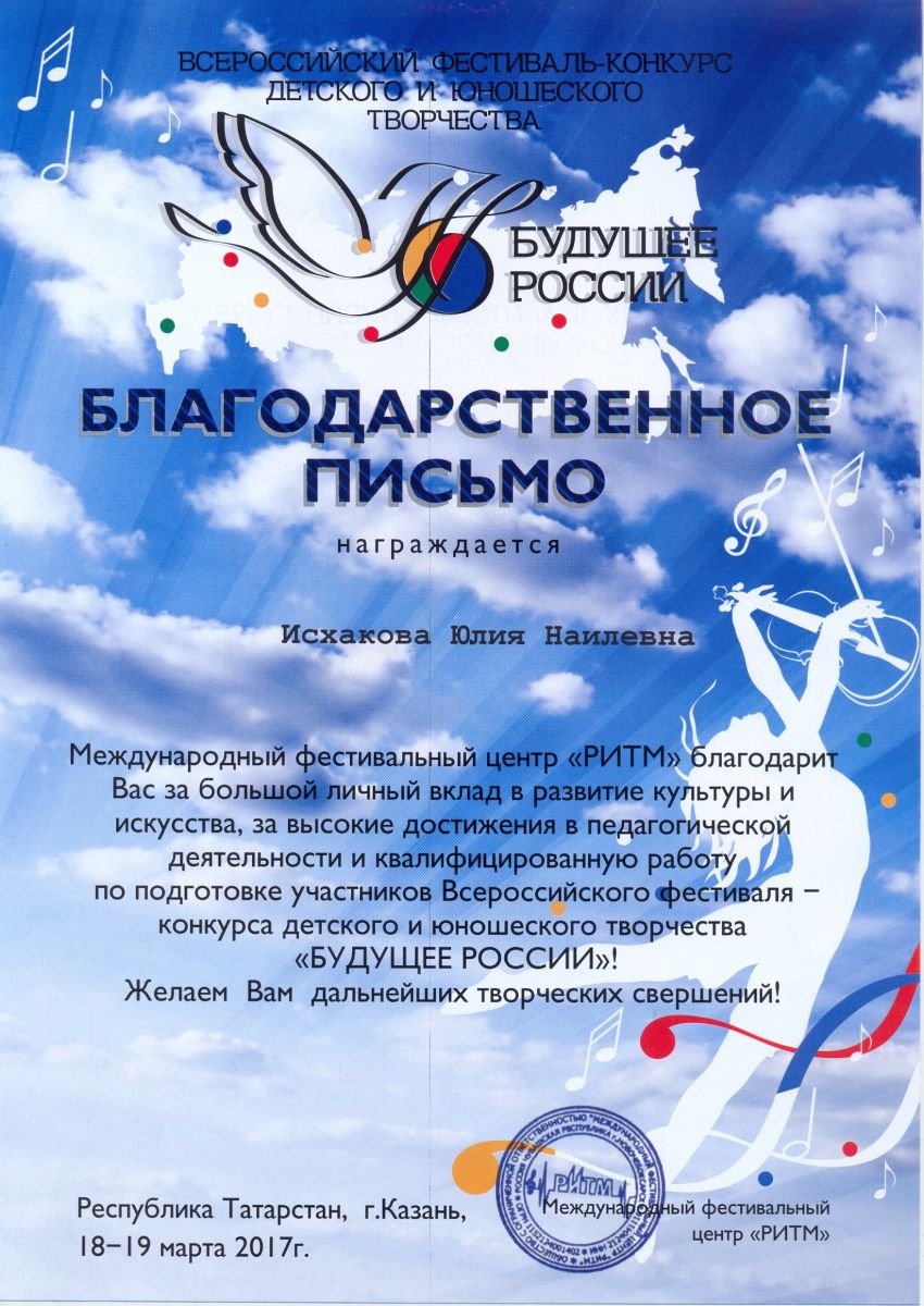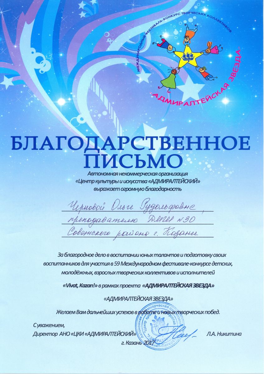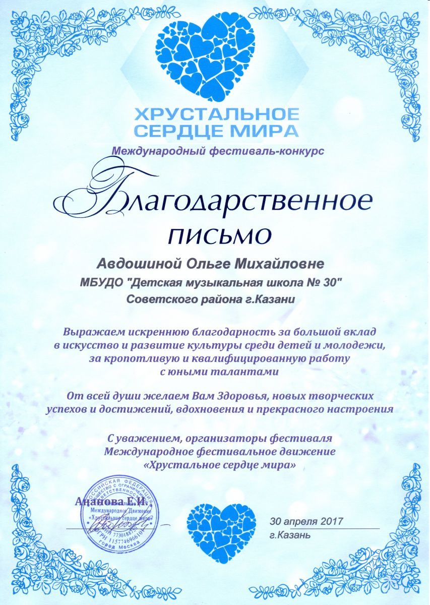 Международный фестиваль-конкурс "Хрустальное сердце мира" - Санукова Н.В. - благодарственное письмо