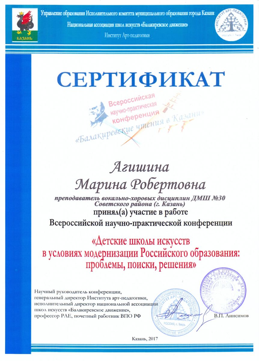 Всероссийская научно-практическая конференция "Детские школы искусств в условиях модернизации Российского образования: проблемы, поиски, решения" - Агишина М.Р. - участник
