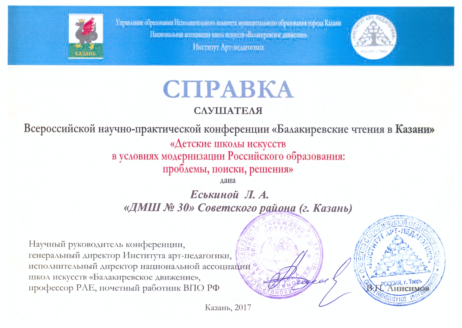 Всероссийская научно-практическая конференция "Детские школы искусств в условиях модернизации Российского образования: проблемы, поиски, решения" - Еськина Л.А. - слушатель