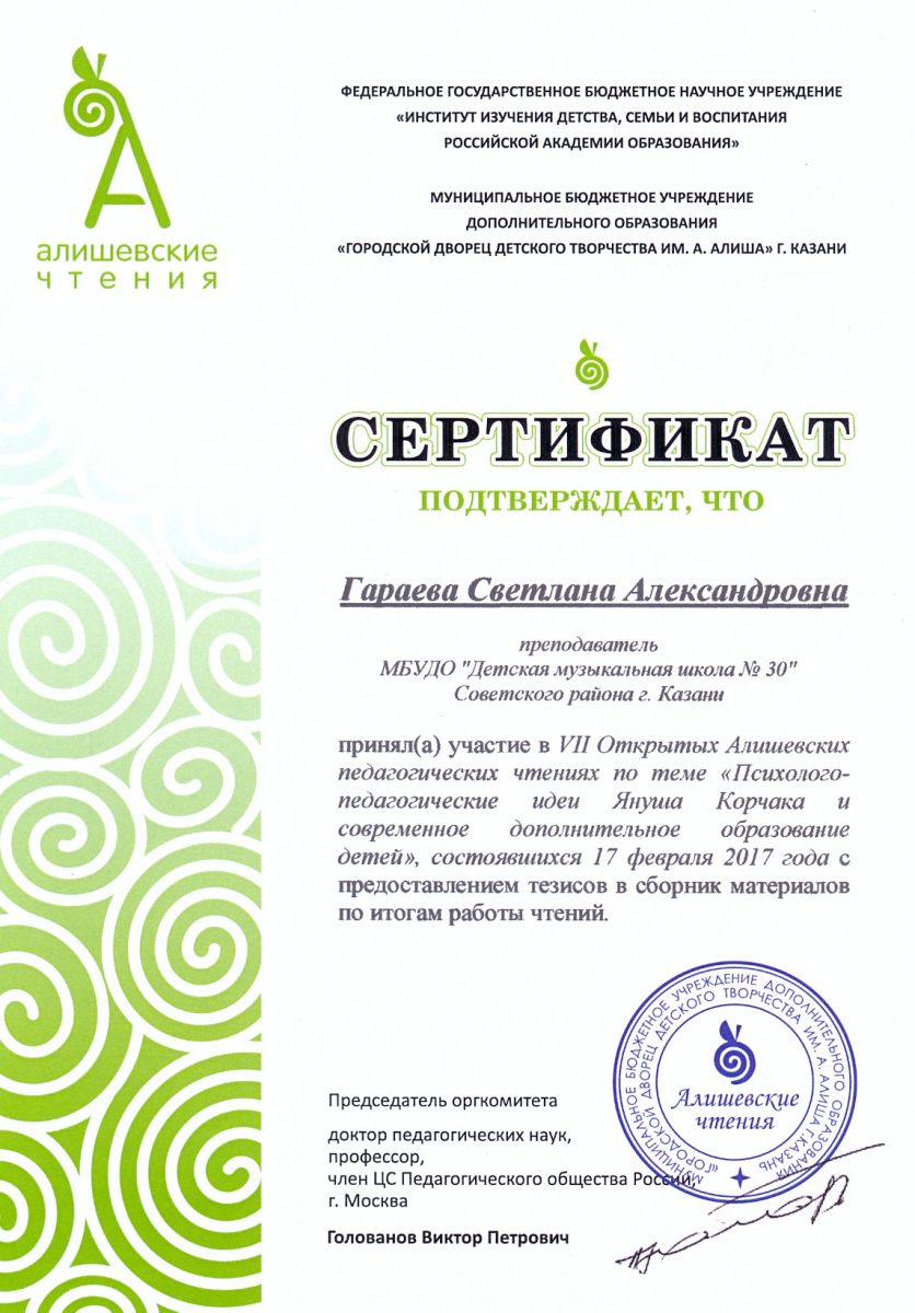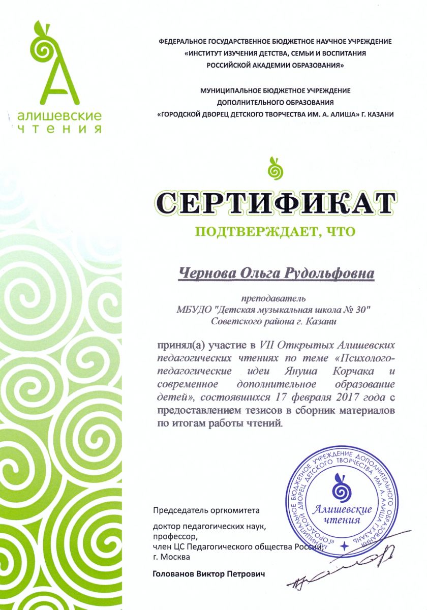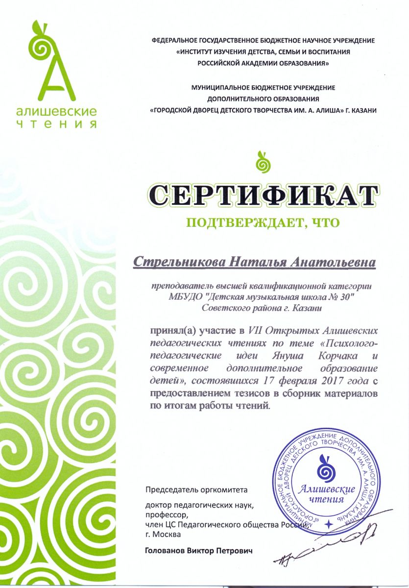 VII Открытые Алишевские педагогические чтения "Психолого-педагогические идеи Януша Корчака и современное дополнительное образование детей" - статья "Взаимодействие ДМШ № 30 с профильными музейными учреждениями Казани и Воткинска" - Стрельникова Н.А.