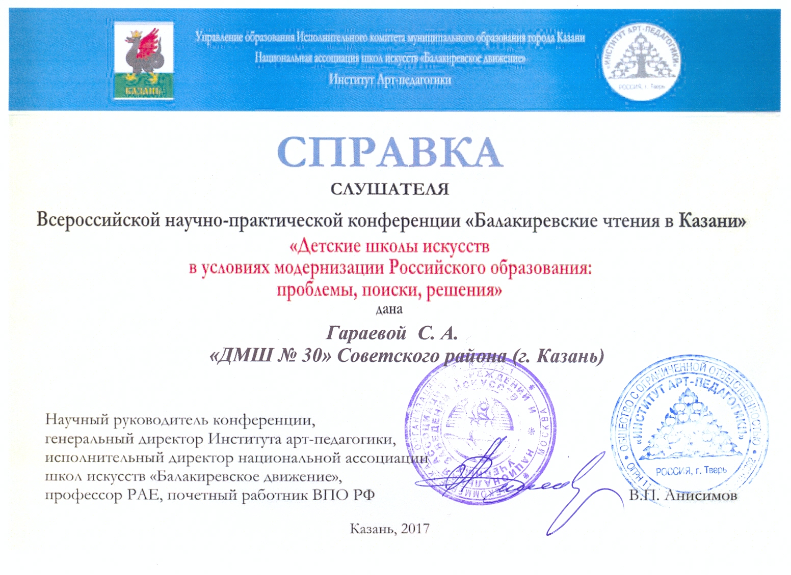 Всероссийская научно-практическая конференция "Детские школы искусств в условиях модернизации Российского образования: проблемы, поиски, решения" - Гараева С.А. - слушатель