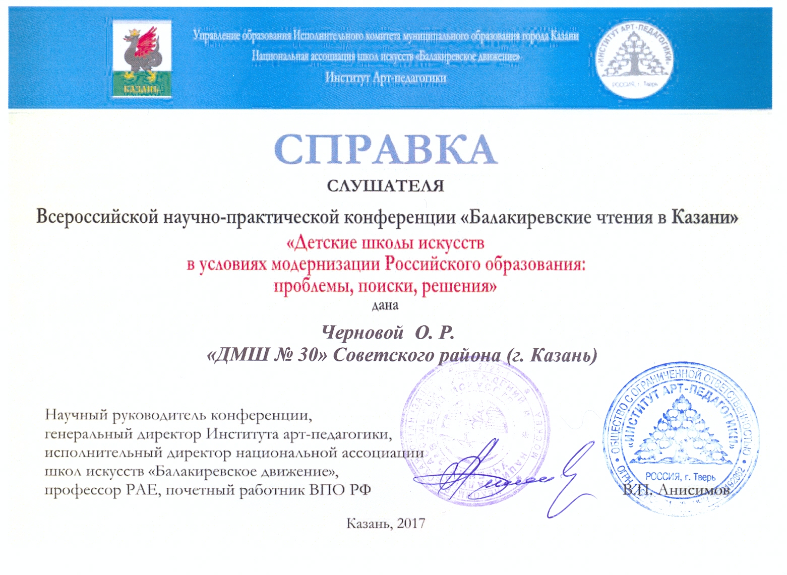 Всероссийская научно-практическая конференция "Детские школы искусств в условиях модернизации Российского образования: проблемы, поиски, решения" - Чернова О.Р. - слушатель