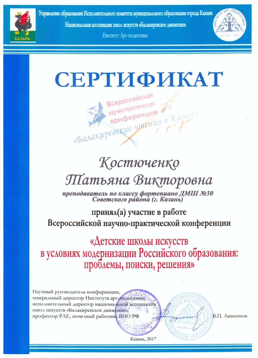 Всероссийская научно-практическая конференция "Детские школы искусств в условиях модернизации Российского образования: проблемы, поиски, решения" - Костюченко Т.В. - участник