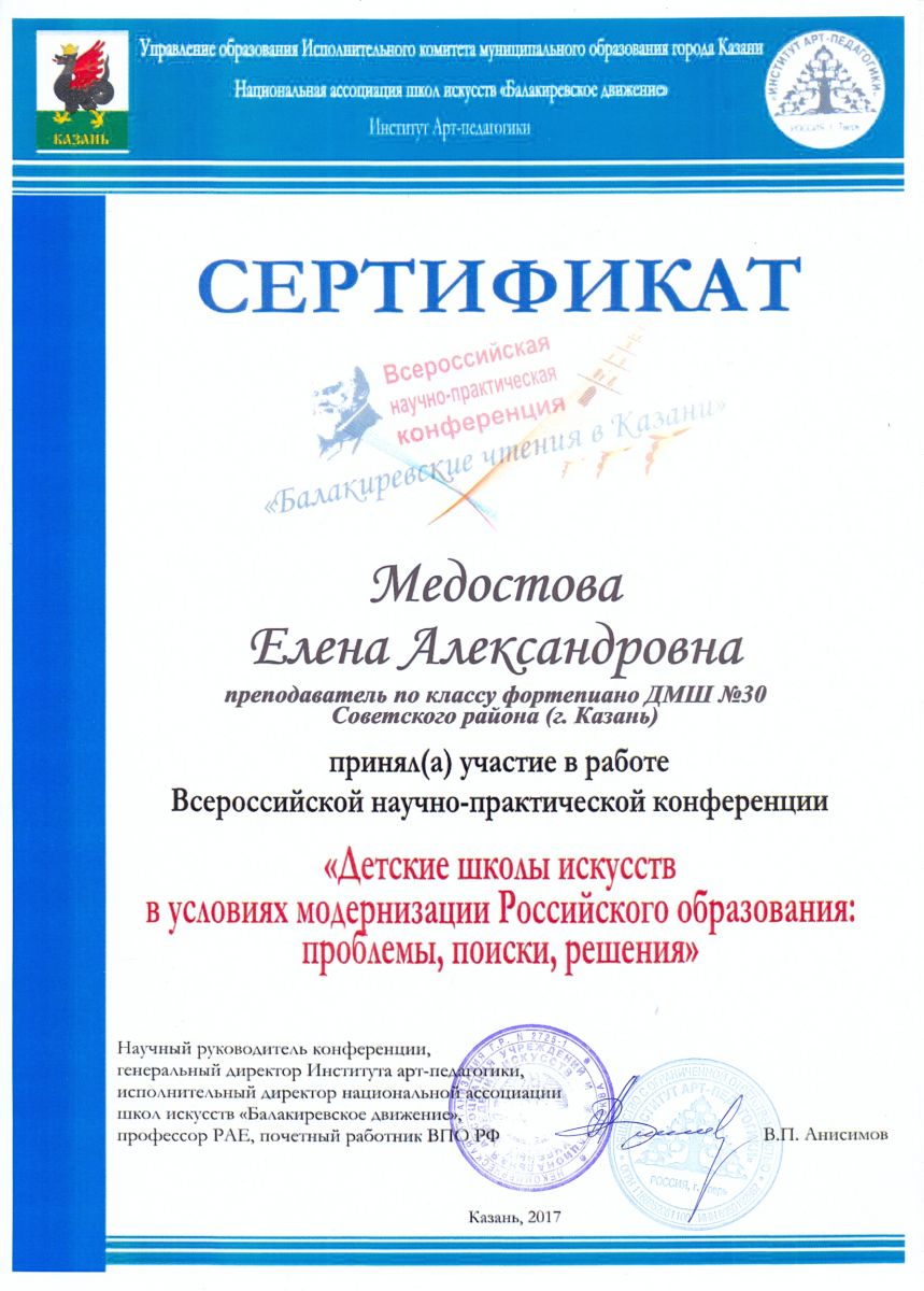Всероссийская научно-практическая конференция "Детские школы искусств в условиях модернизации Российского образования: проблемы, поиски, решения" - Медостова Е.А. - участник