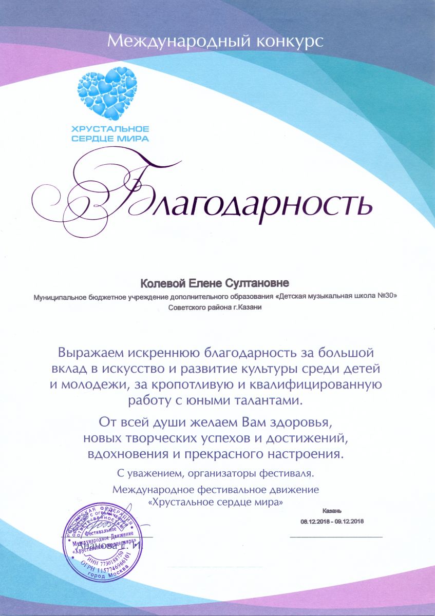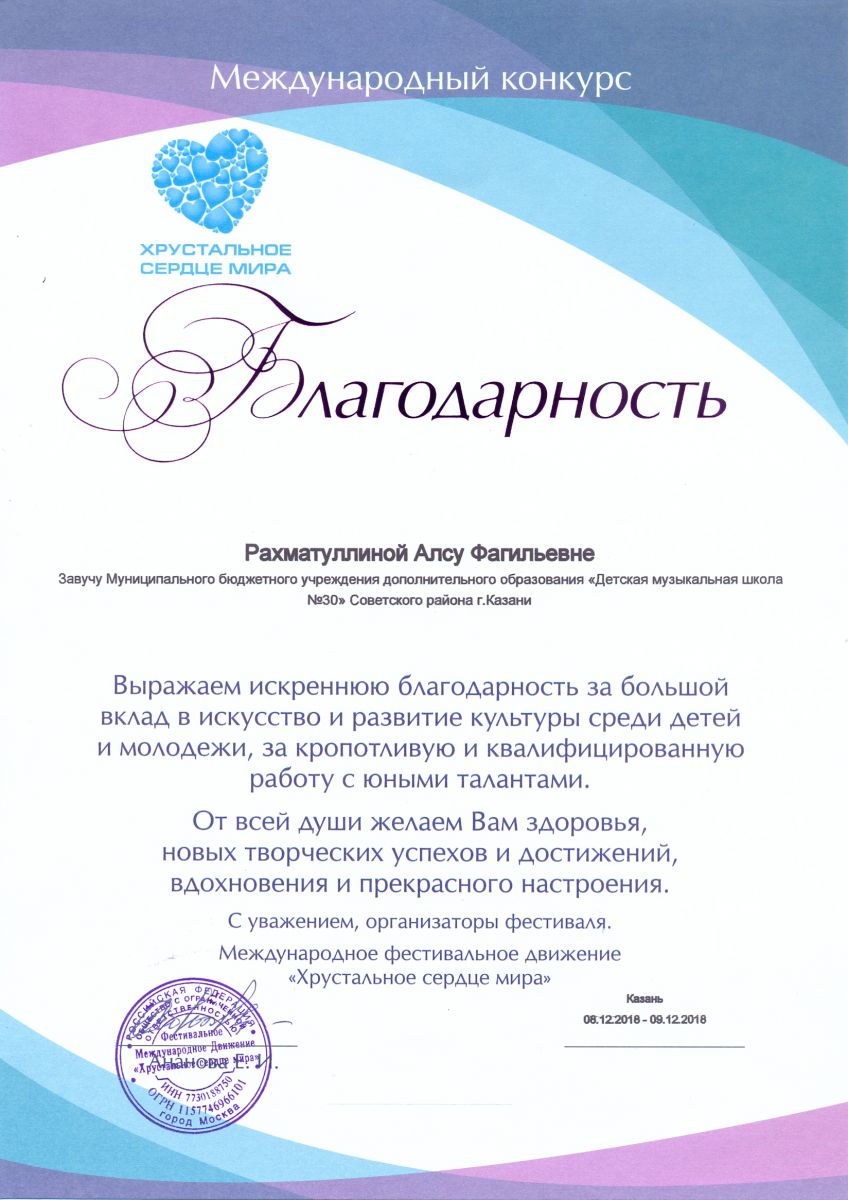 Международный конкурс-фестиваль "На крыльях таланта" - Камалова Ю.З. - благодарность