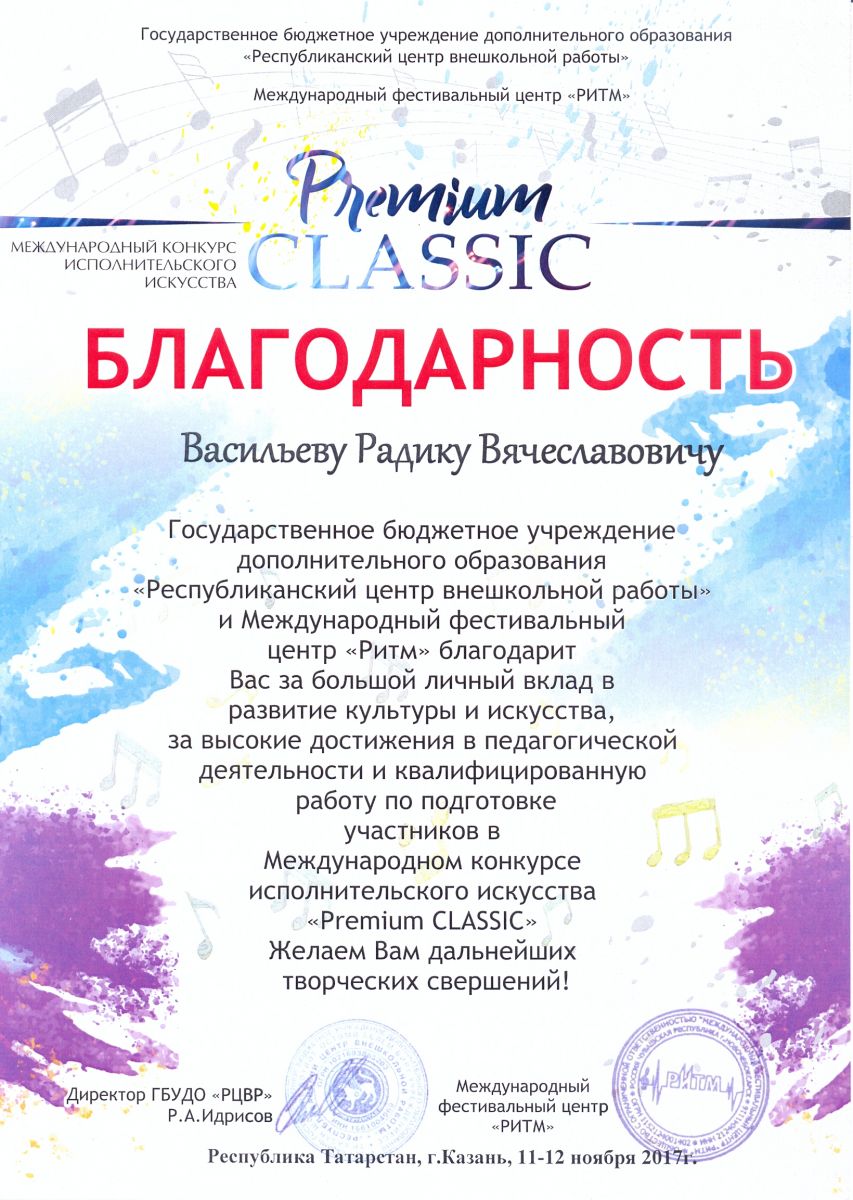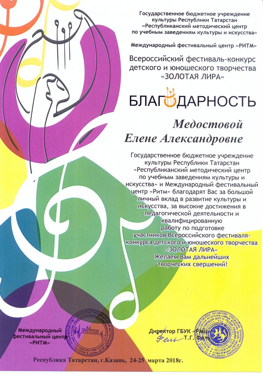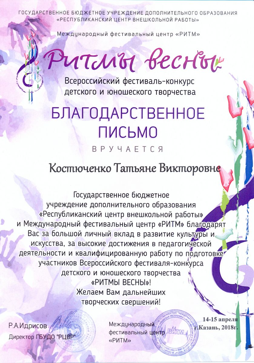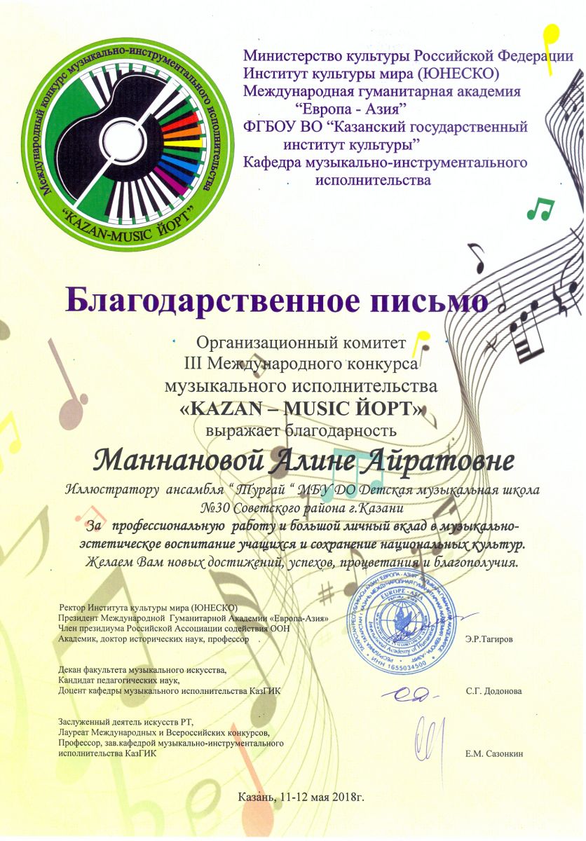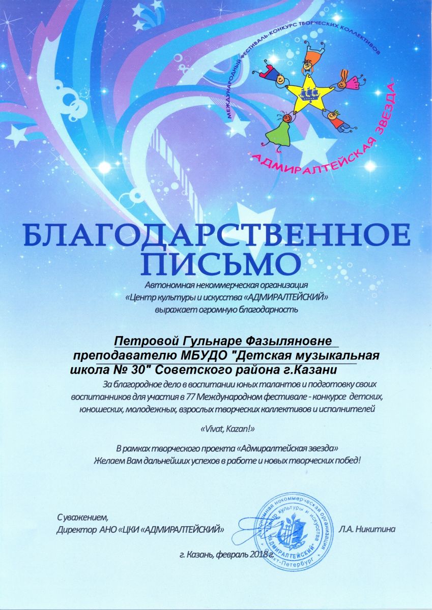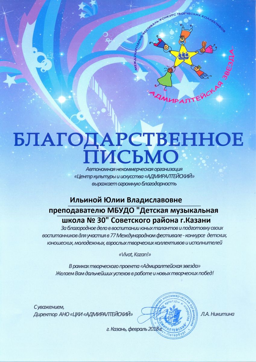 Международный конкурс-фестиваль "На крыльях таланта" - Камалова Ю.З. - благодарность