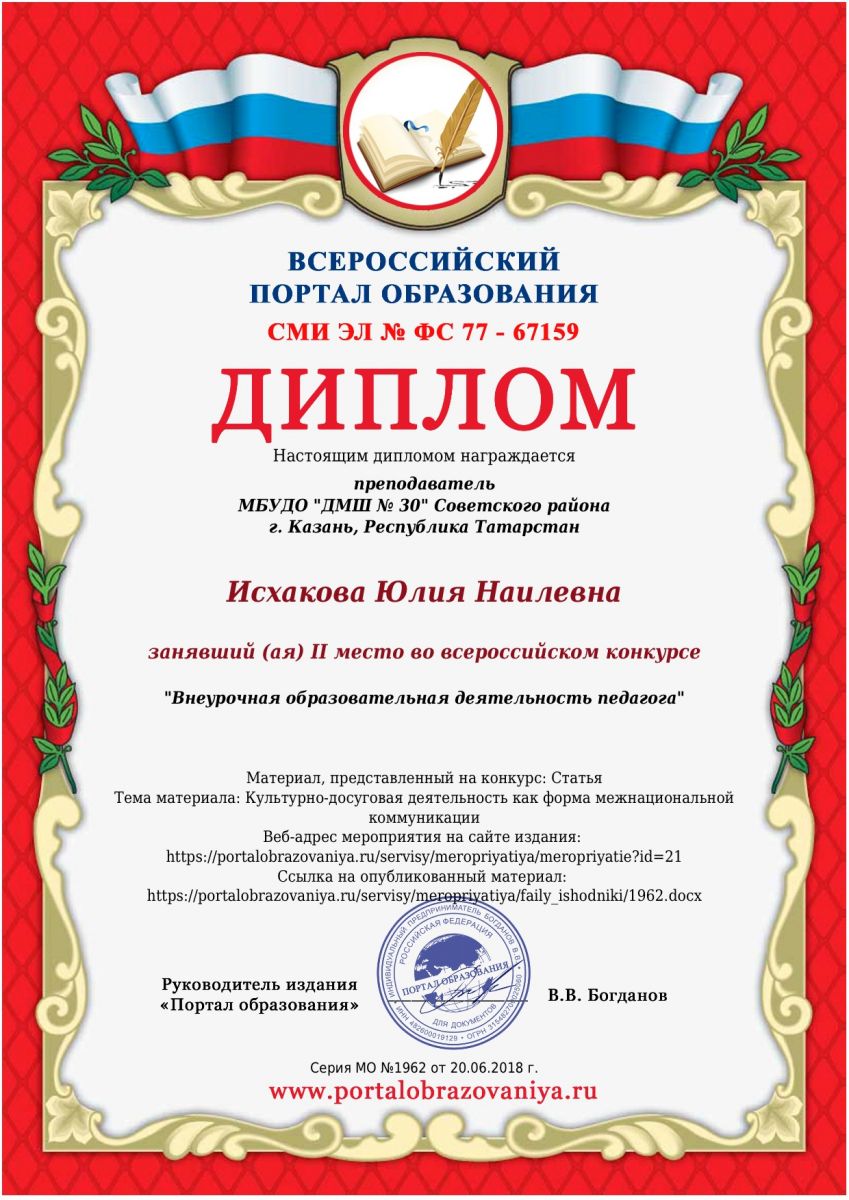 Всероссийский конкурс "Внеурочная образовательная деятельность педагога" - Исхакова Ю.Н. - II место
