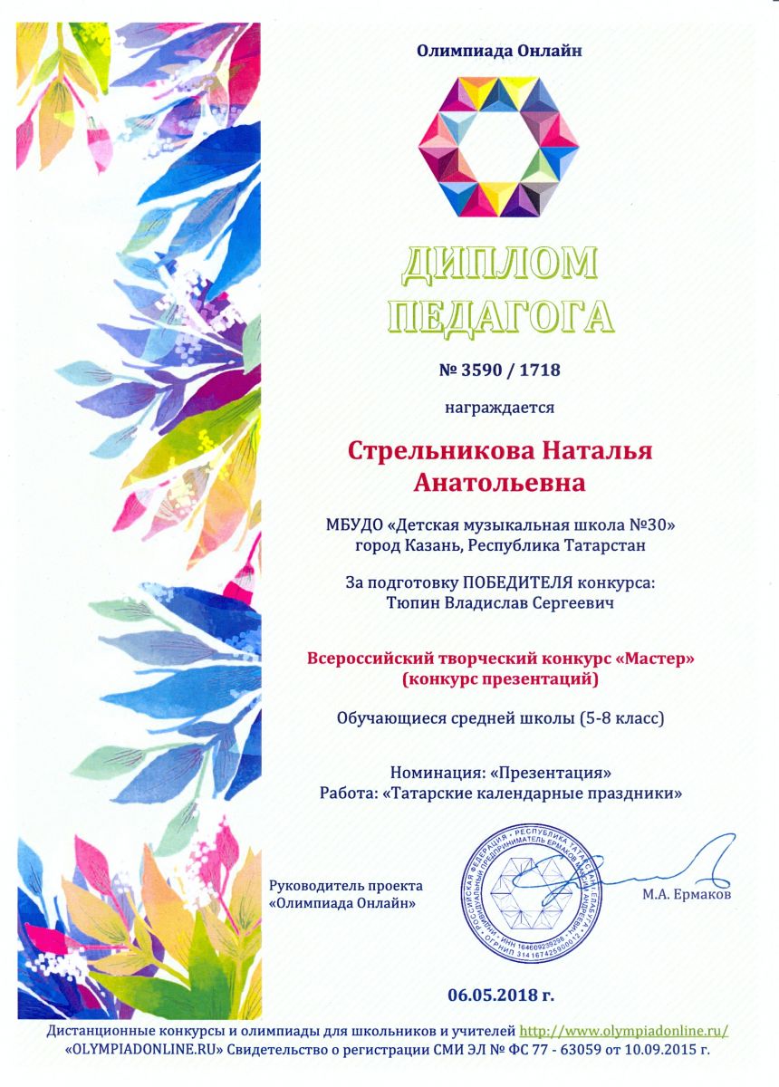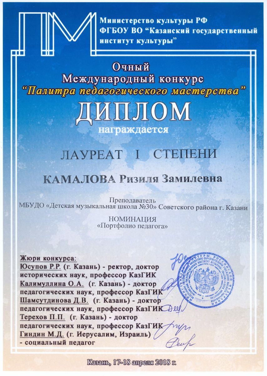 Очный Международный конкурс "Палитра педагогического мастерства" - Камалова Р.З. - I место