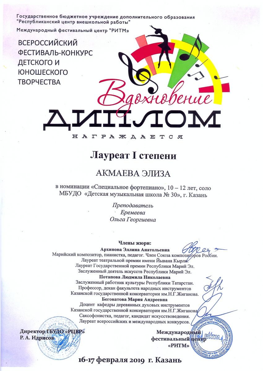 Всероссийский фестиваль-конкурс "Вдохновение" - Акмаева Элиза - I место