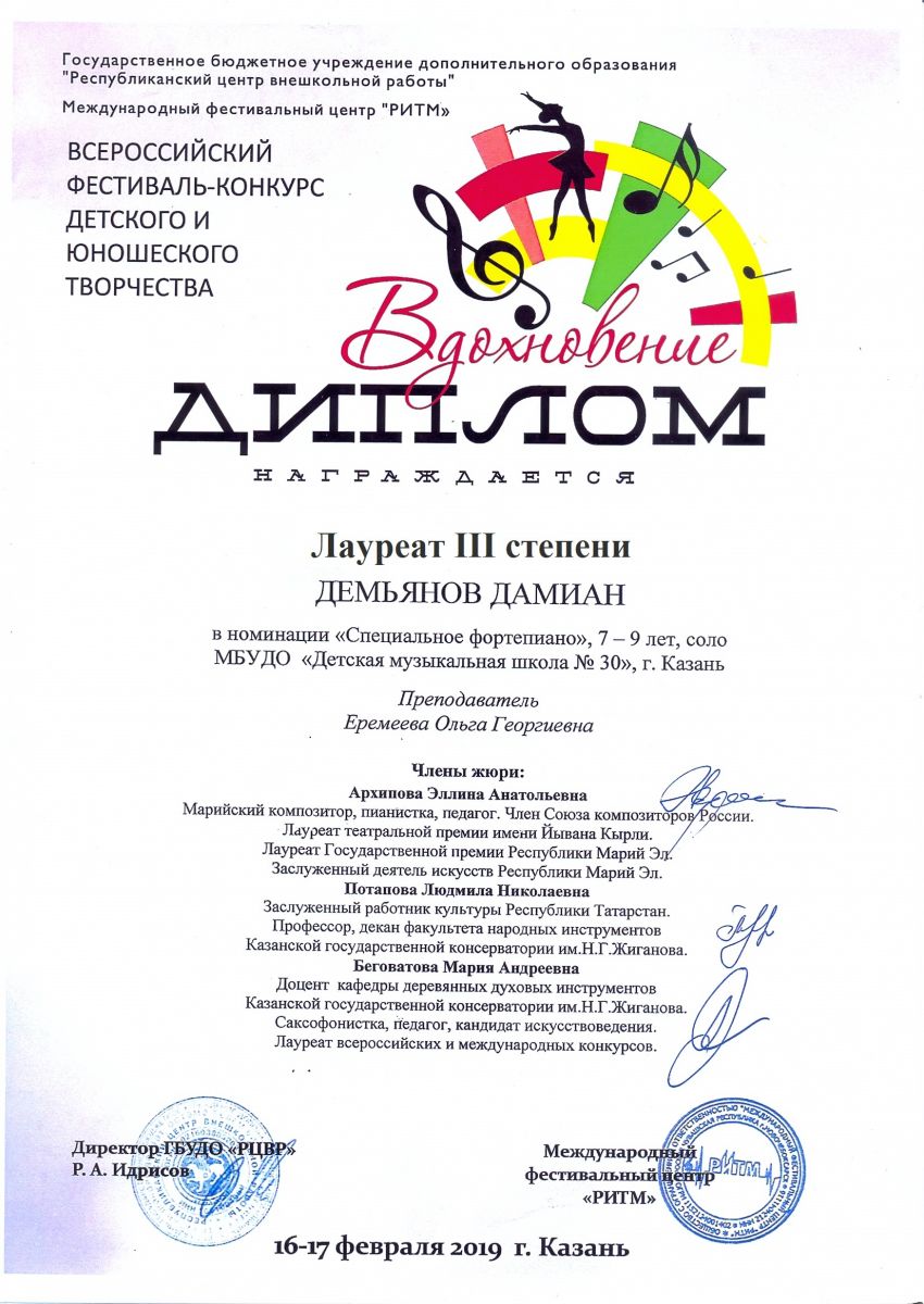 Всероссийский фестиваль-конкурс "Вдохновение" - Демьянов Дамиан - III место