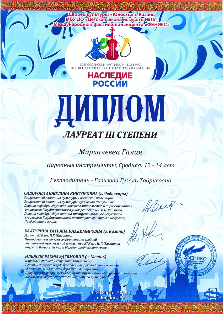 Всероссийский фестиваль-конкурс "Вдохновение" - Мирхалеева Галия - III место