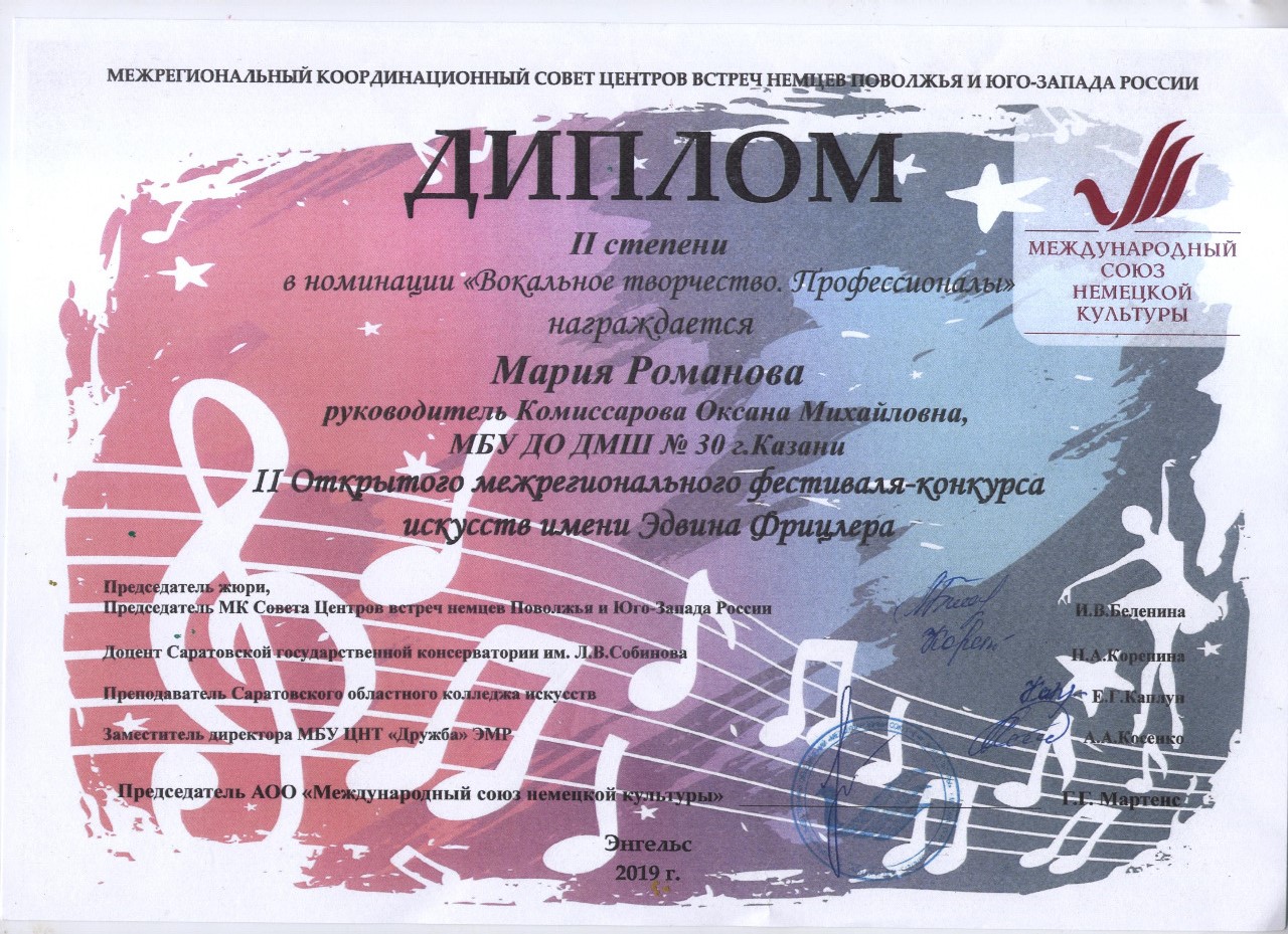 Межрегиональный фестиваль-конкурс искусств им.Эдивна Фрицлера - Романова Мария - II место