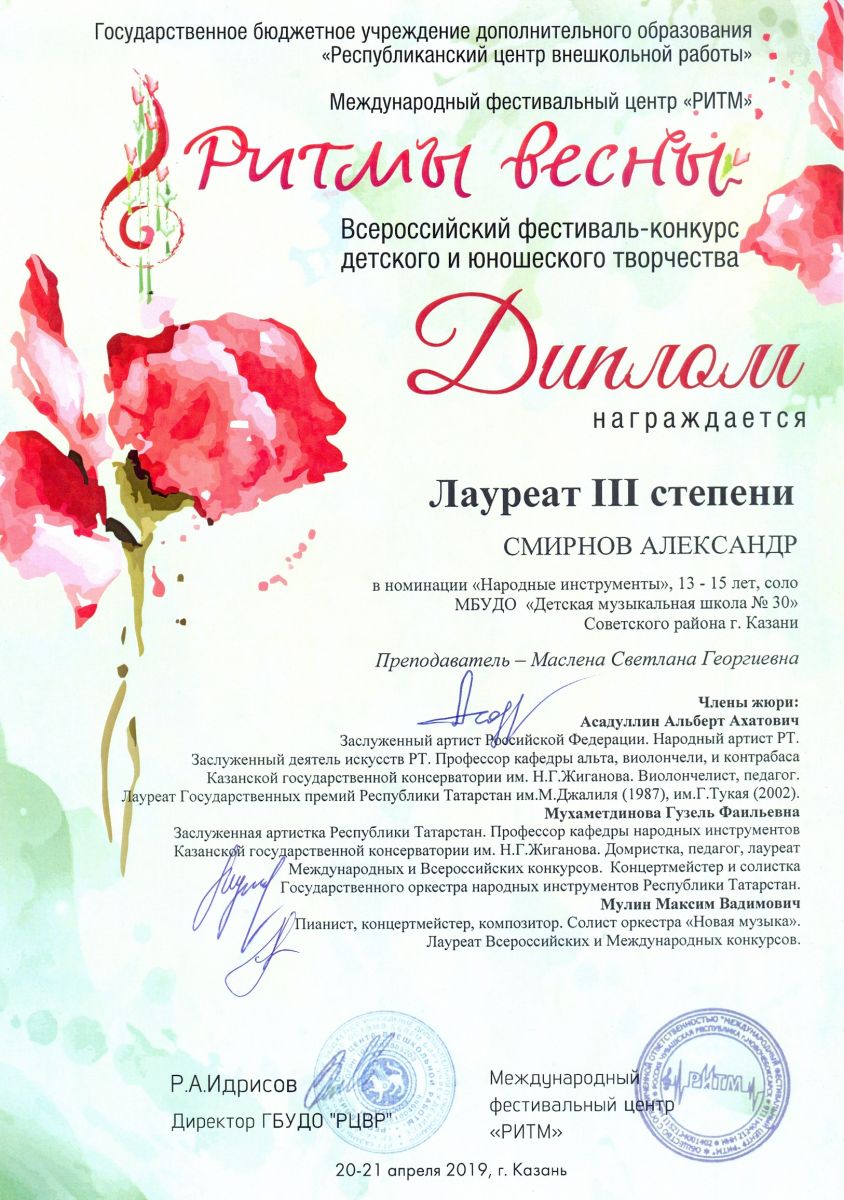 Всероссийский фестиваль-конкурс "Вдохновение" - Ахметзянов Муса - III место