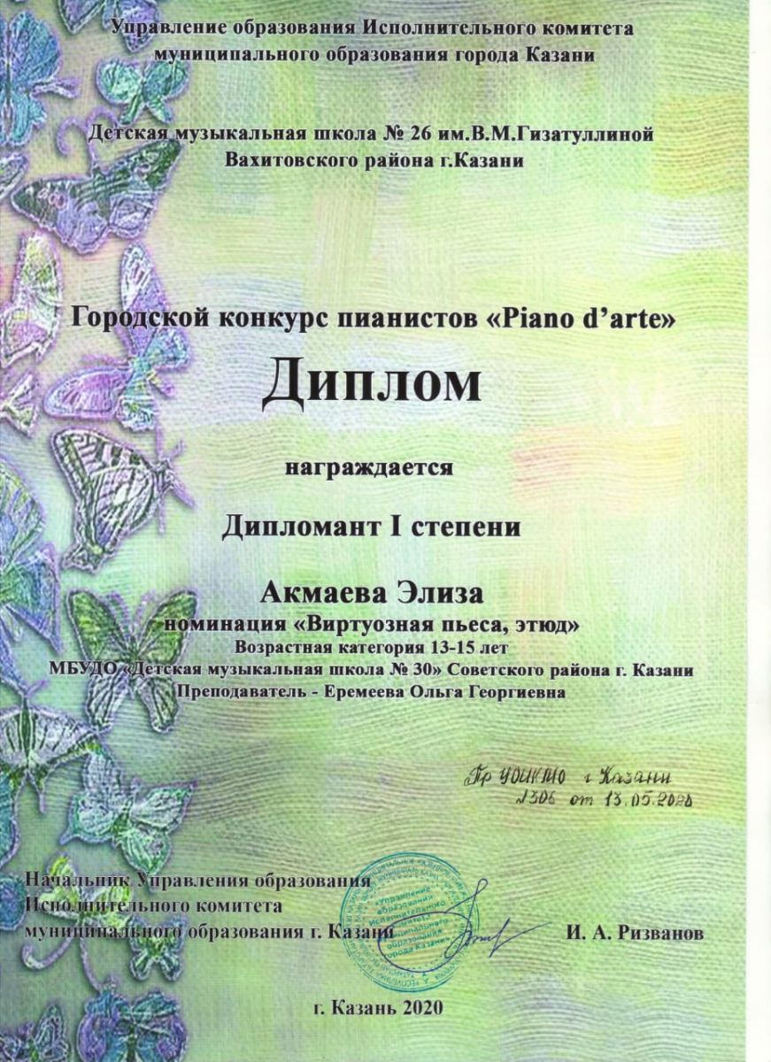 Городской конкурс пианистов "Piano d' arte" - Акмаева Элиза - диплом I степени