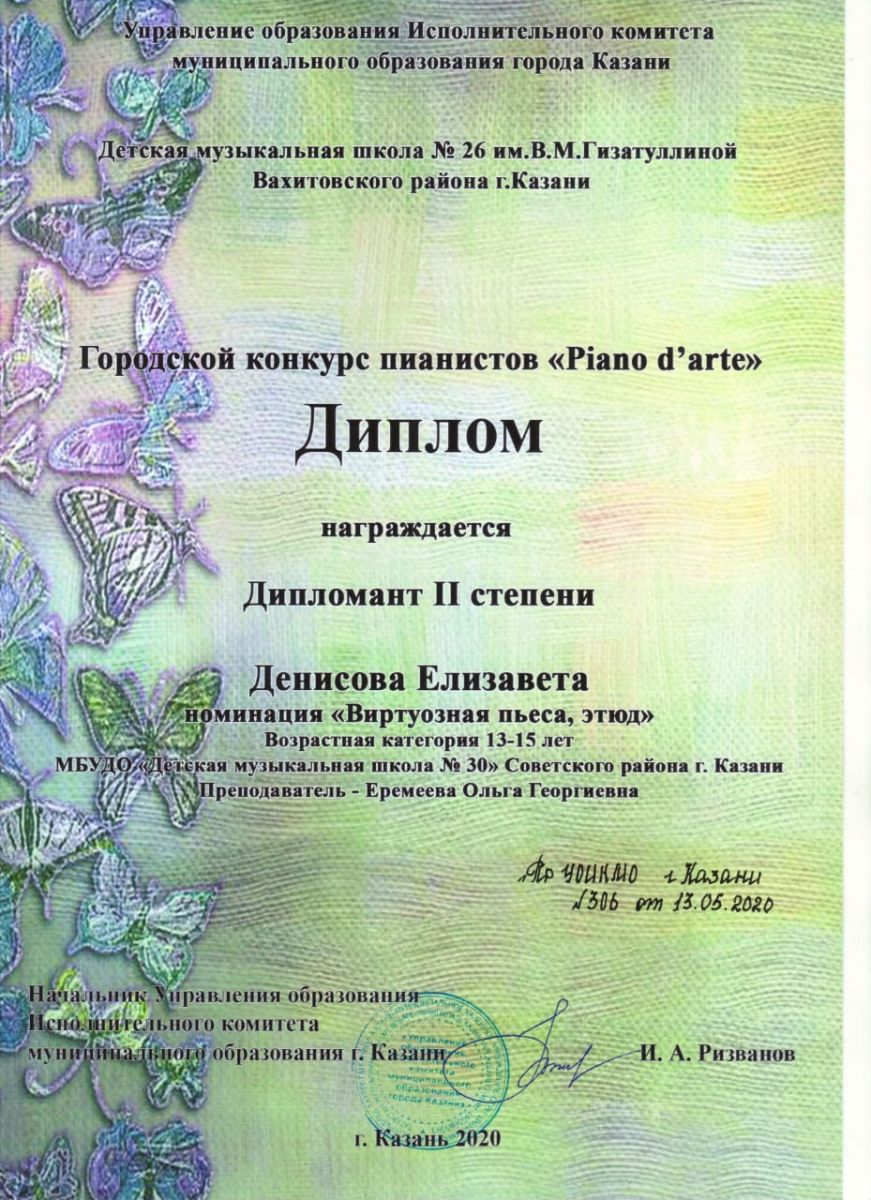 Городской конкурс пианистов "Piano d' arte" - Денисова Елизавета - диплом II степени