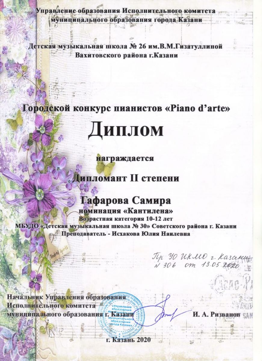 Городской конкурс пианистов "Piano d' arte" - Гафарова Самира - диплом II степени