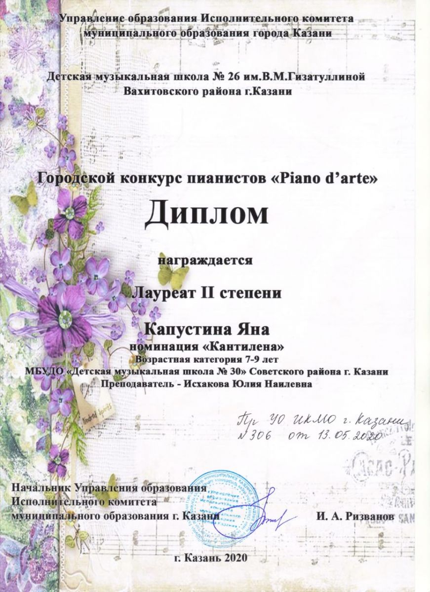 Городской конкурс пианистов "Piano d' arte" - Капустина Яна - II место