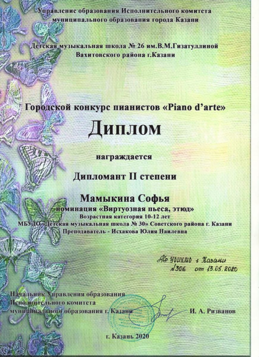 Городской конкурс пианистов "Piano d' arte" - Мамыкина Софья - III место (номинация "полифония")