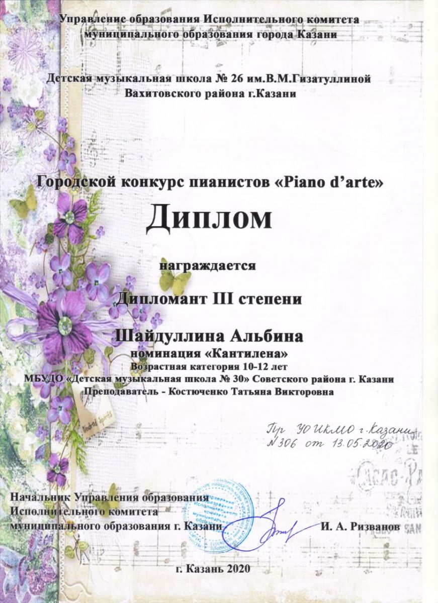 Городской конкурс пианистов "Piano d' arte" - Шайдуллина Альбина - диплом III степени