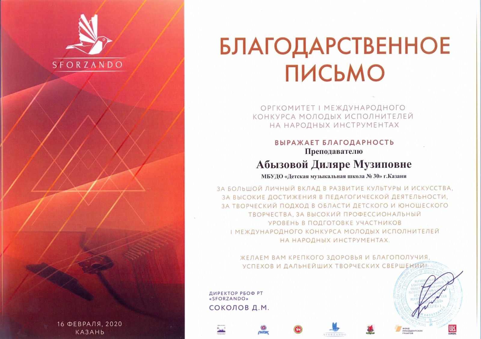 I Международный конкурс исполнителей на народных инструментах "SFORZANDO" - Абызова Д.М. - Благодарственное письмо