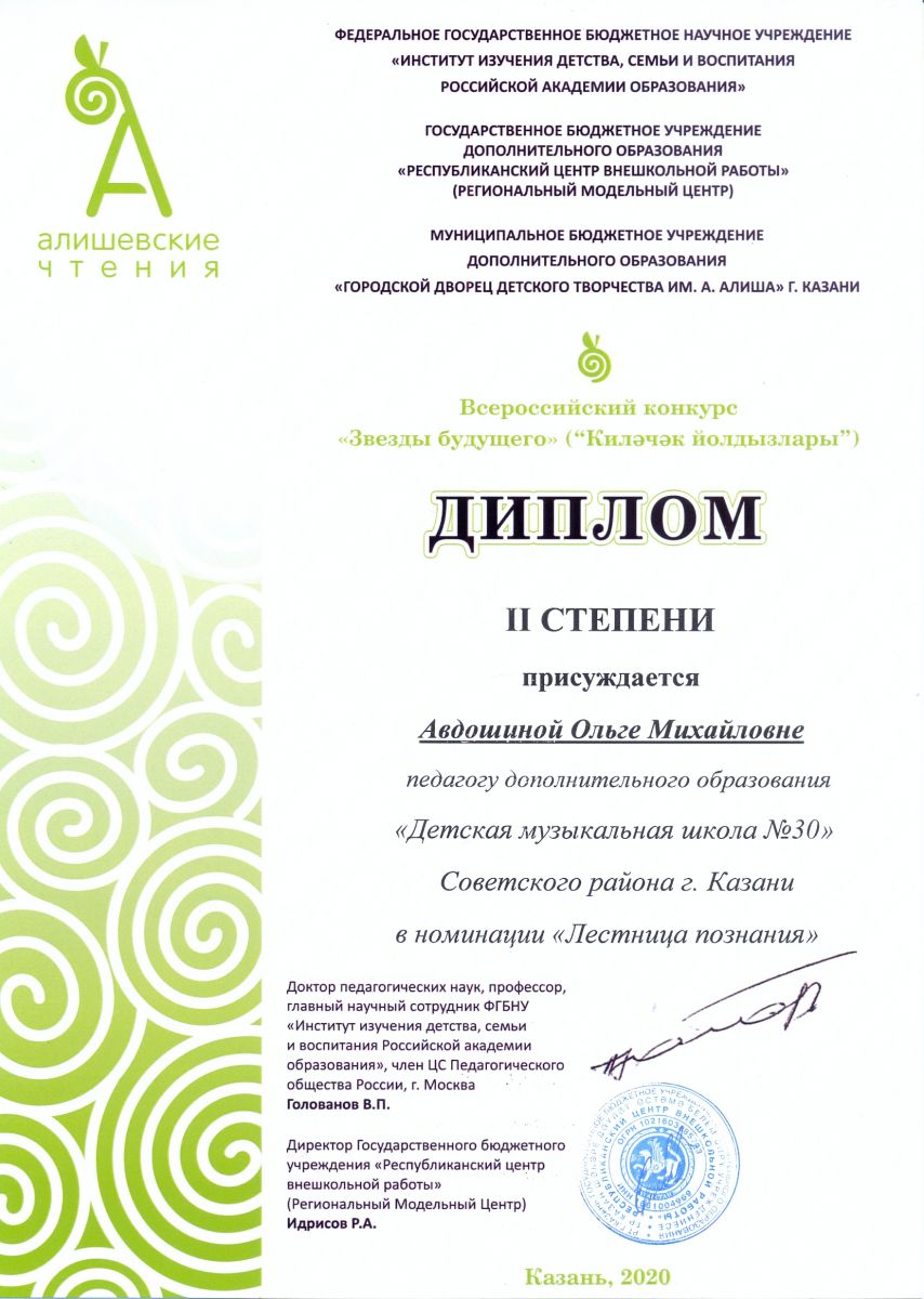 Всероссийский конкурс "Звезды будущего" ("Киләчәк йәлдызлары") в рамках Алишевских чтений - Авдошина О.М. - диплом II степени в номинации "Лестница познания"