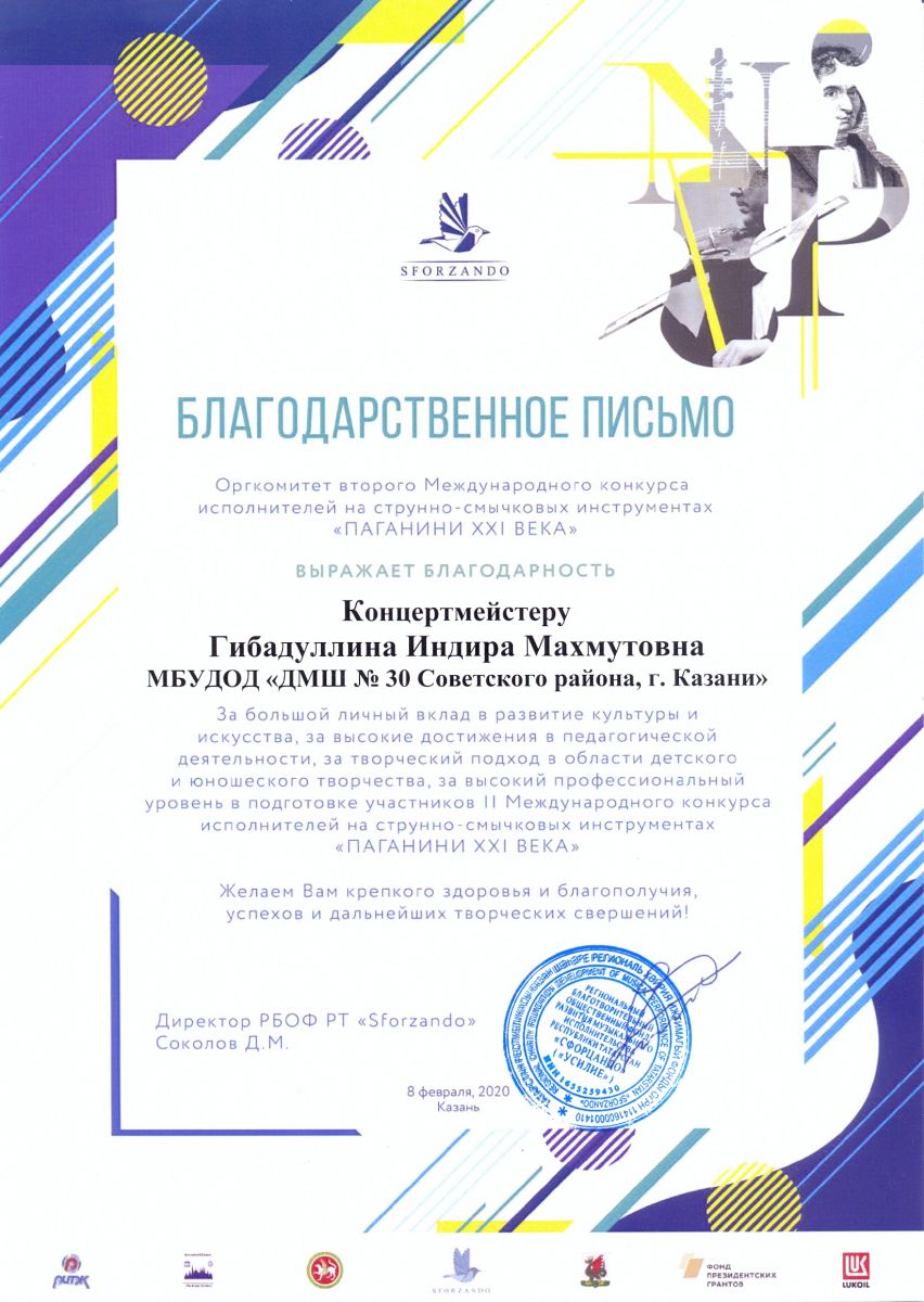 II Международный конкурс исполнителей на струнно-смычковых инструментах "Паганини XXI века" - Гибадуллина И.М. - Благодарственное письмо