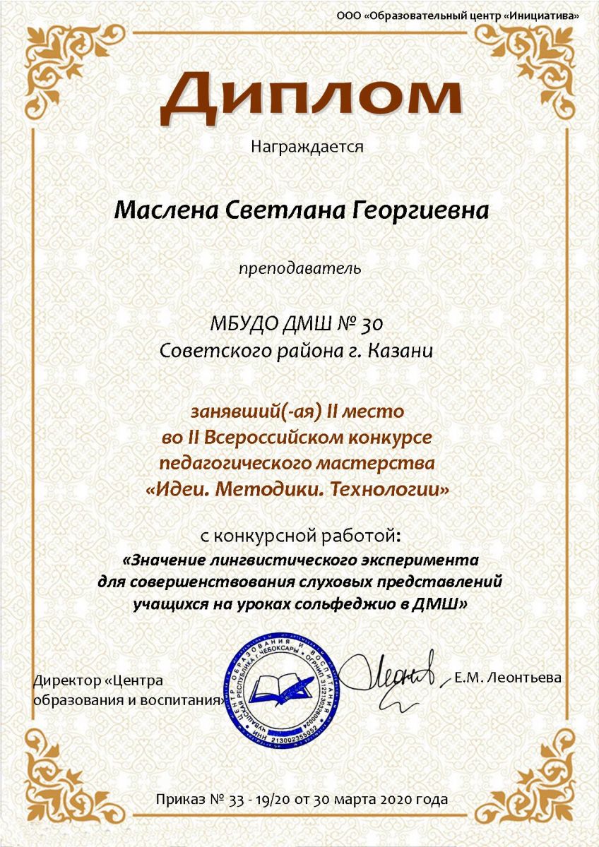 II Всероссийский конкурс педагогического мастерства "Идеи.Методики.Технологии" - Маслена С.Г. - II место
