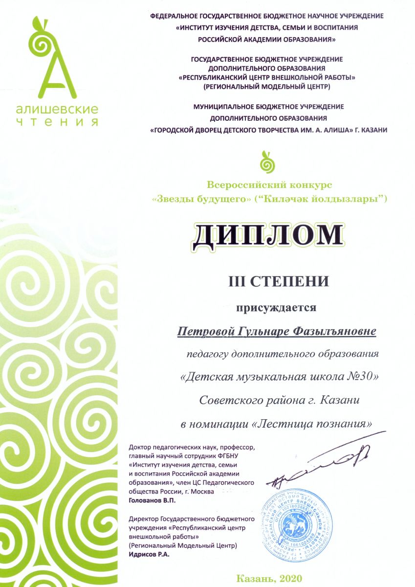Всероссийский конкурс "Звезды будущего" ("Киләчәк йәлдызлары") в рамках Алишевских чтений - Петрова Г.Ф. - диплом III степени в номинации "Лестница познания"