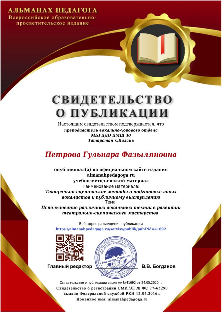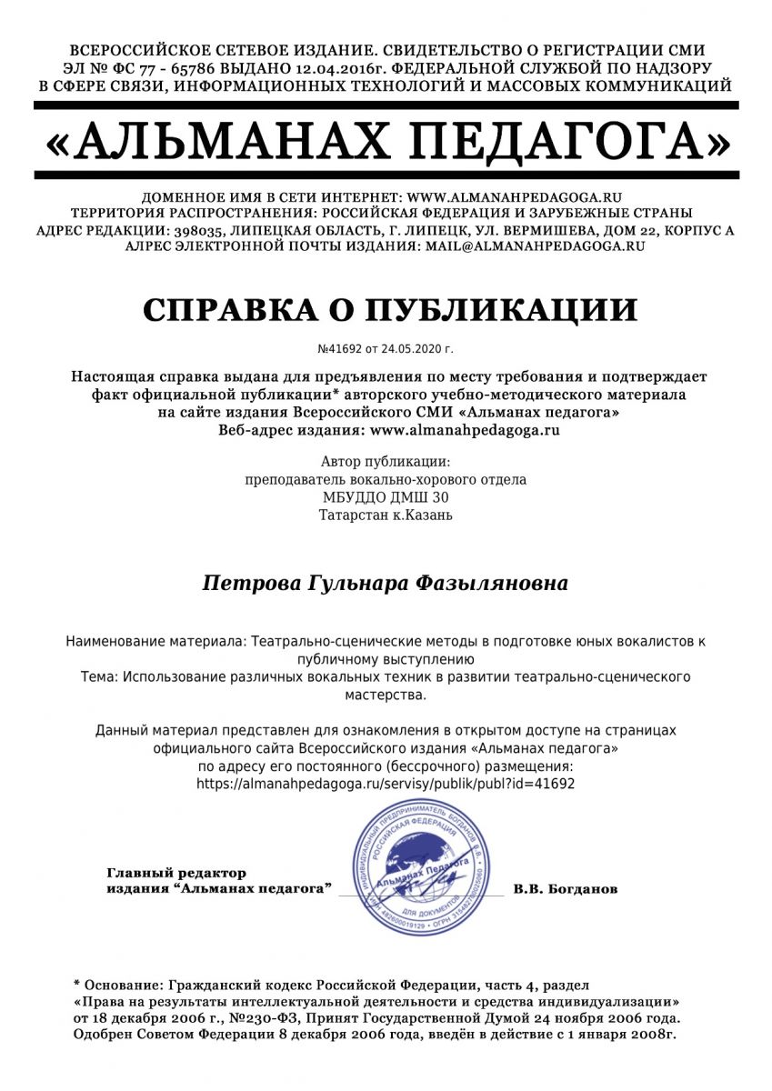 Всероссийское сетевое издание "Альманах педагога" - статья Петровой Г.Ф. "Теортально-сценические методы в подготовке юных вокалистов к публичному выступлению"