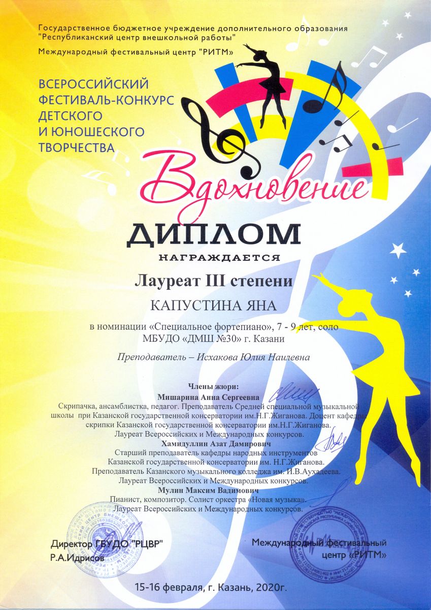 Всероссийский конкурс "Творческая карусель" - Капустина Яна - II место