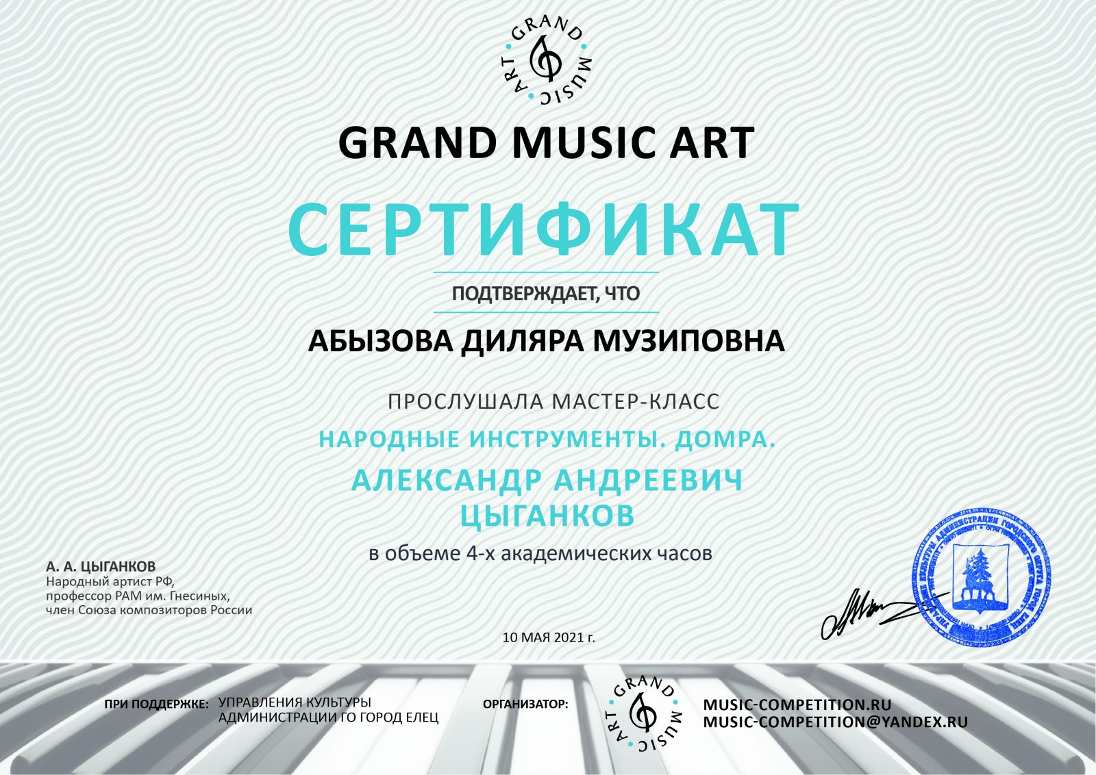 Мастер-класс у Цыганкова А.А. Народные инструменты. Домра "Grand music art" - Абызова Д.М. - сертификат