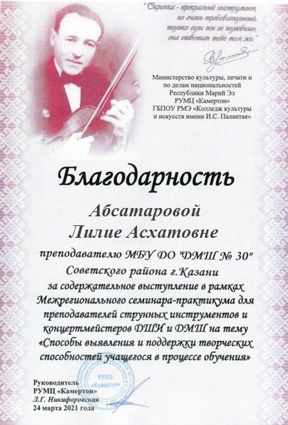 Межрегиональный семинар-практикум для преподавателей струнно-смычковых инструментов "Способы выявления и поддержки творческих способностей учащихся в процессе обучения" (г.Йошкар-Ола) - Абсатарова Л.А. - выступление с докладом "Работа со скрипачами детского симфонического оркестра"