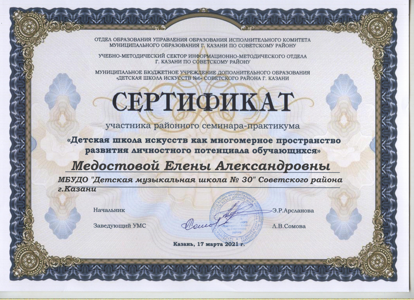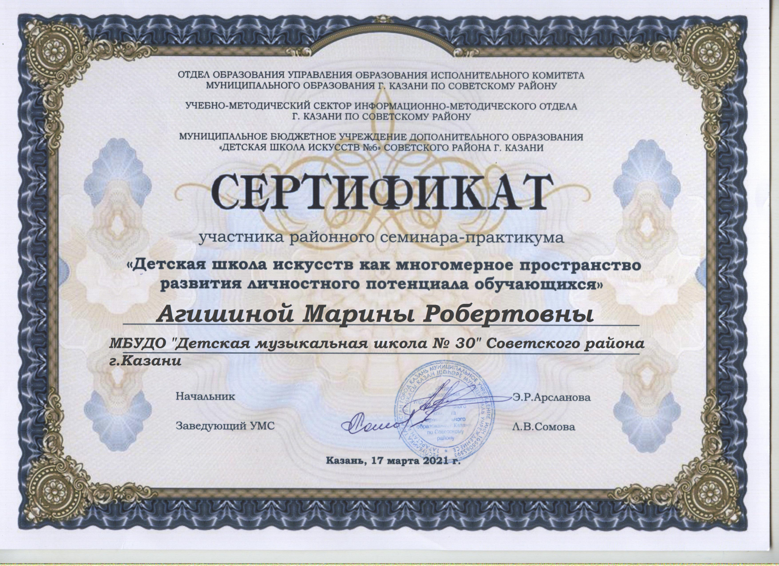 Районный семинар-практикум "Детская школа искусств как многомерное пространство развития личностного потенциала обучающихся" - Камалова Ю.З. - Сертификат