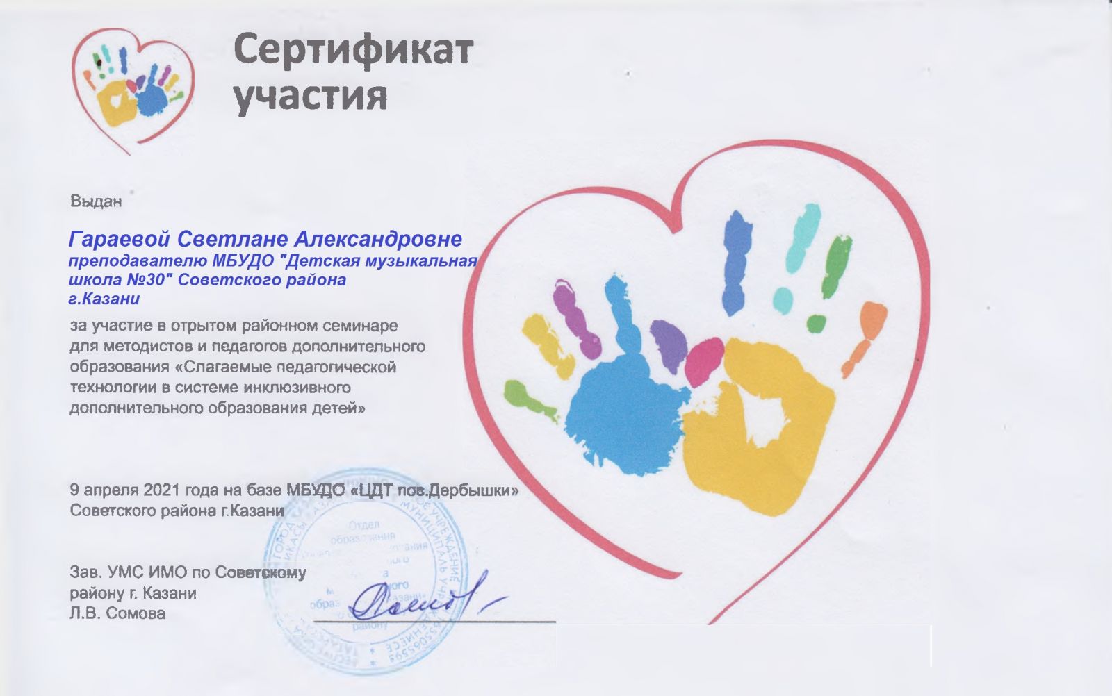 Открытый районный семинар для методистов и педагогов дополнительного образования "Слагаемые педагогической технологии в системе инклюзивного дополнительного образования детей" - Гараева С.А. - сертификат участия