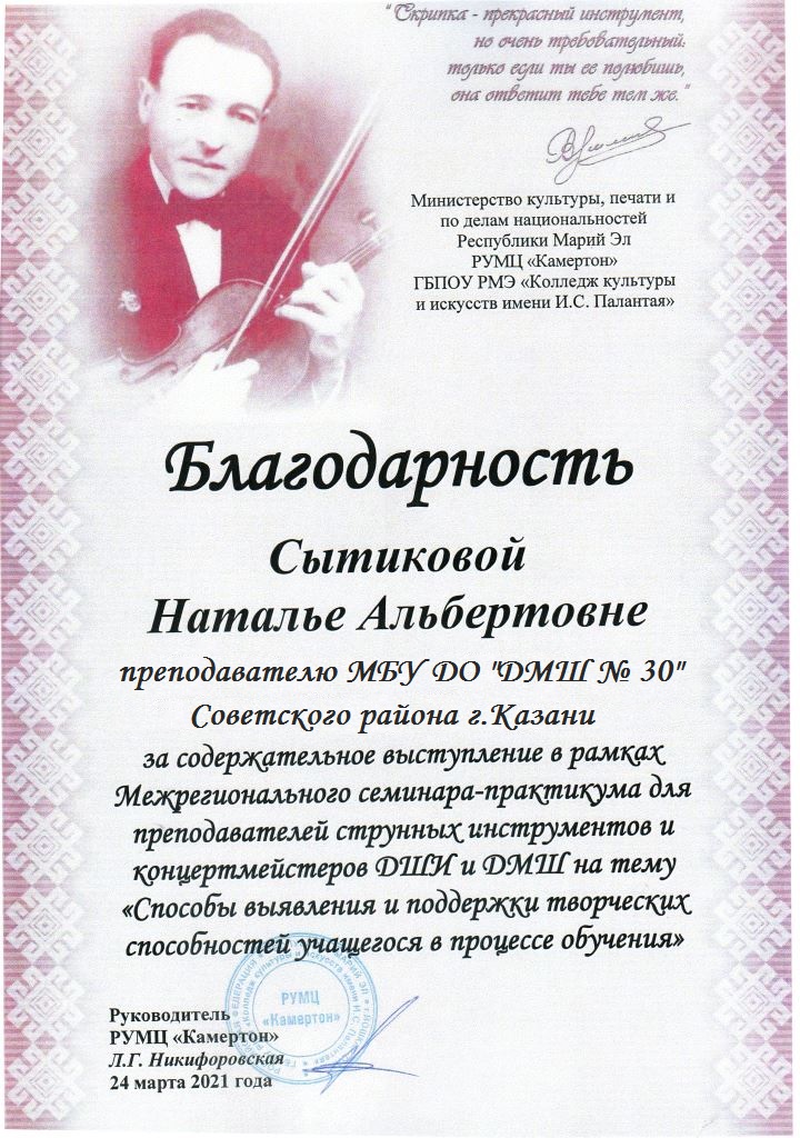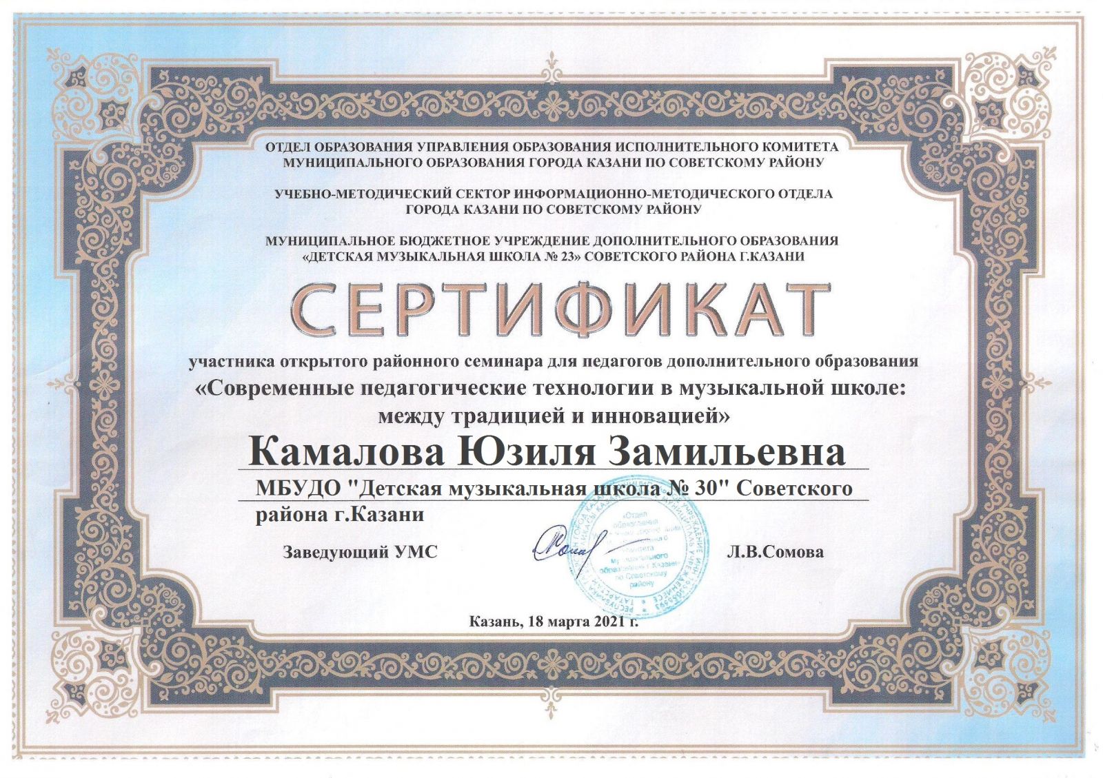 Открытый районный семинар для педагогов дополнительного образования "Современные педагогические технологии в музыкальной школе: между традицией и инновацией" - Камалова Ю.З. - Сертификат