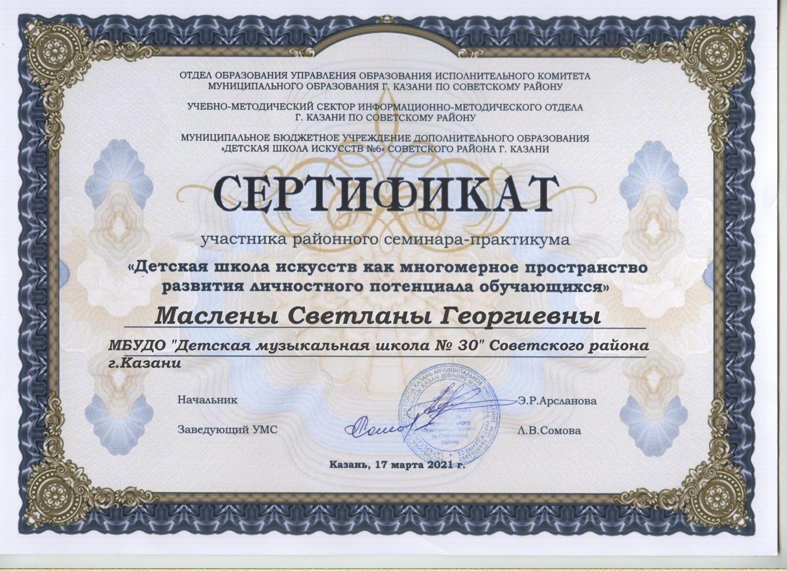 Районный семинар-практикум "Детская школа искусств как многомерное пространство развития личностного потенциала обучающихся" - Маслена С.Г. - Сертификат