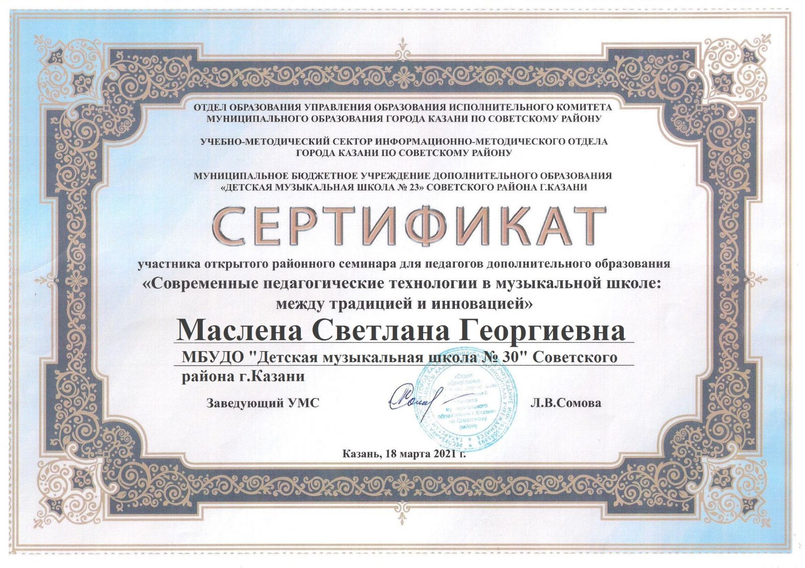 Открытый районный семинар для педагогов дополнительного образования "Современные педагогические технологии в музыкальной школе: между традицией и инновацией" - Маслена С.Г. - Сертификат