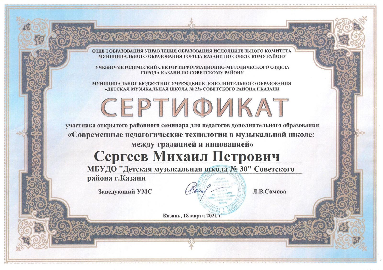 Открытый районный семинар для педагогов дополнительного образования "Современные педагогические технологии в музыкальной школе: между традицией и инновацией" - Сергеев М.П. - Сертификат