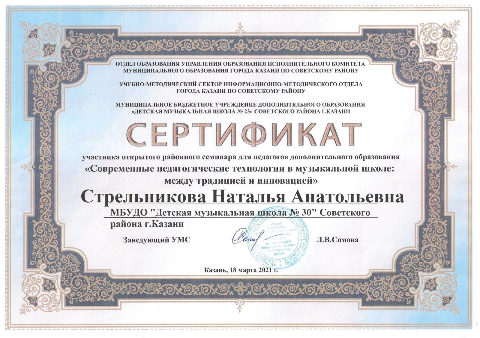 Открытый районный семинар для педагогов дополнительного образования "Современные педагогические технологии в музыкальной школе: между традицией и инновацией" - Стрельникова Н.А. - Сертификат
