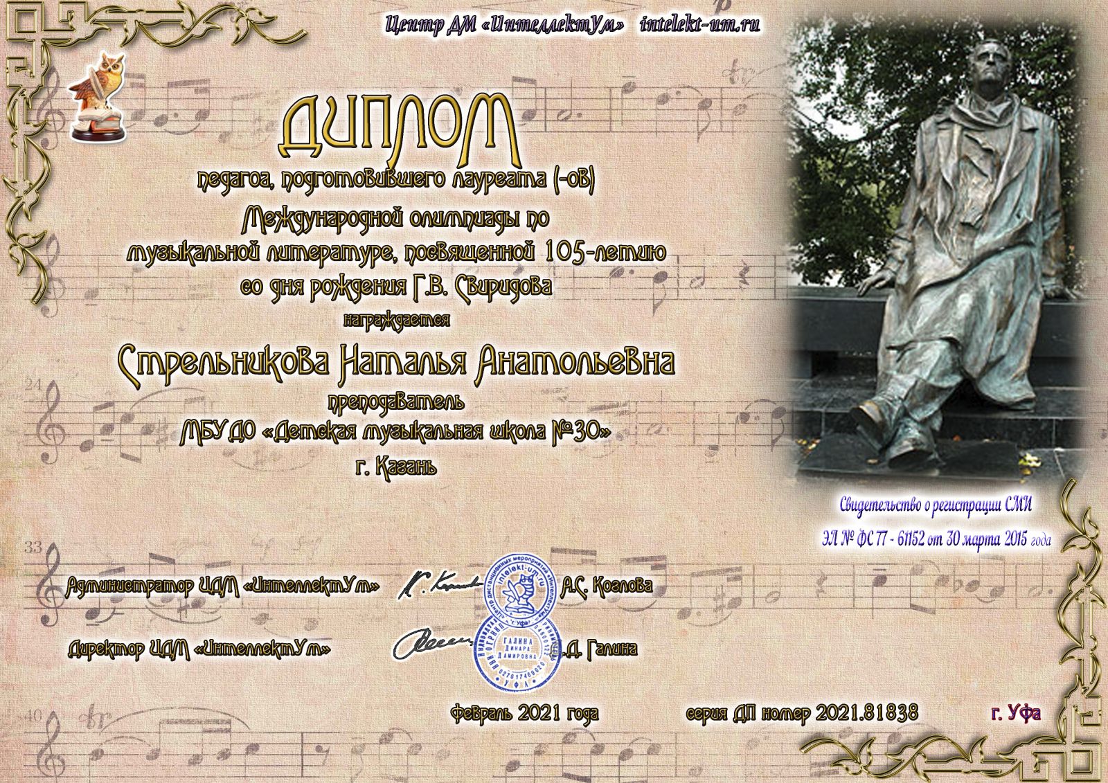 Всероссийский конкурс "Академия искусств" - Стрельникова Н.А. - диплом Лучший преподаватель