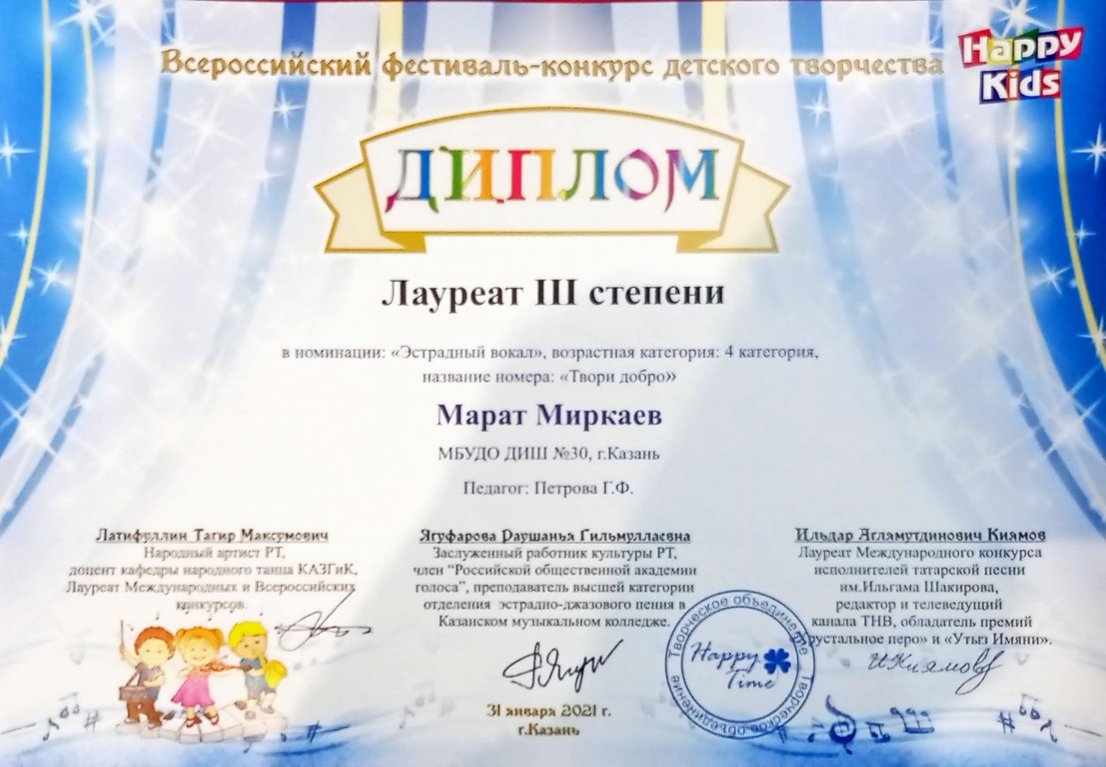 Всероссийский фестиваль-конкурс детского творчества "Happy Kids" - Миркаев Марат - III место