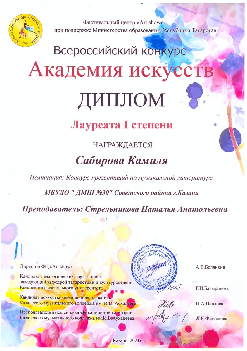 Всероссийский конкурс "Академия искусств" - Сабирова Камиля - I место
