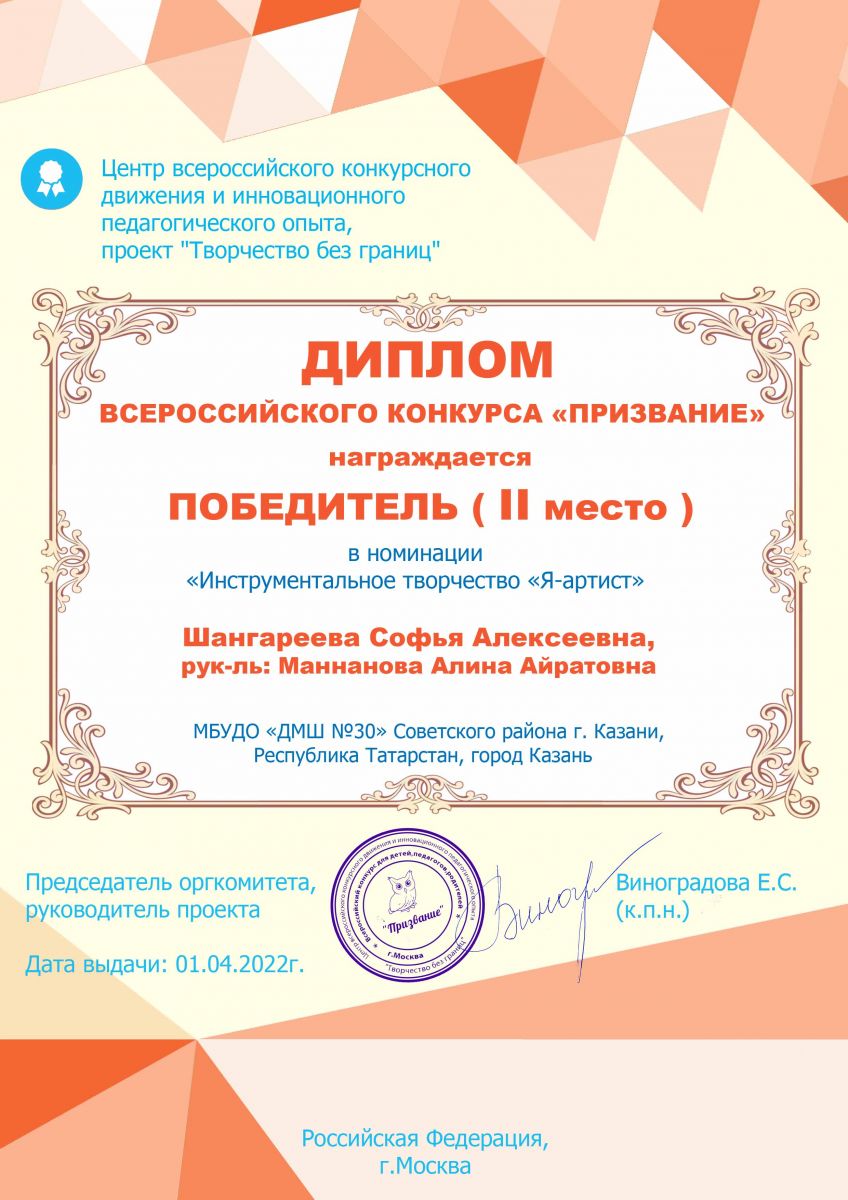 Всероссийский конкурс "Призвание" - Шангареева Софья - II место