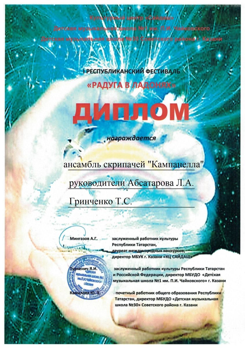 I Республиканский фестиваль "Радуга в ладонях" - ансамбль скрипачей "Кампанелла" - диплом
