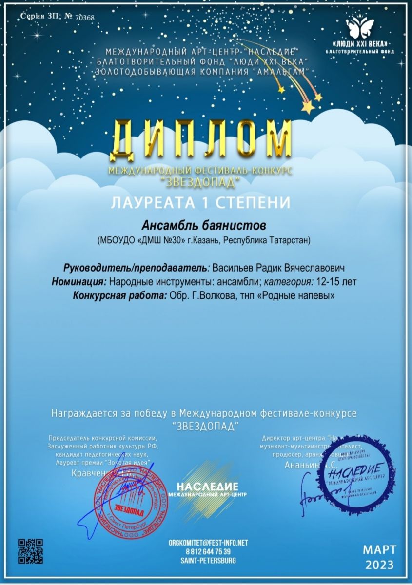 Международный фестиваль-конкурс искусства и творчества "Мир талантов" - ансамбль баянистов - I место